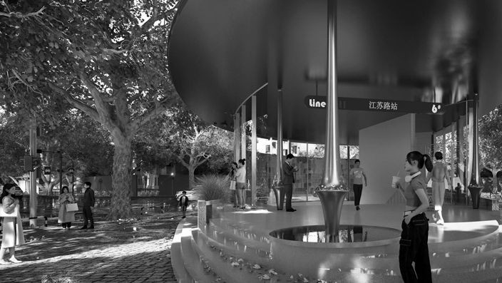 2号线是上海最早的地铁线之一,天天坐着2号线上班的人可能不会注意到它的改变。未来,你偶尔走到愚园路上,一定会被其中一座建筑吸引。在这条历史文化风貌小马路上,有的是沧桑感十足的建筑,而其中一栋绿房子融洽而特立独行地矗立在其中。这就是某设计公司设计的2号线江苏路站的车站。设计师提取历史形式和质感,打造新旧交织的都市体验。最终,设计呈现一处街角公园,地铁站入口宛如两片树叶,于晨昏流转中静待熙攘游人,谱写繁忙都市的日常诗意。