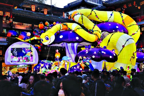 “山海奇妙生机勃发,万物美好不负韶华”,中心广场呈现“天地人和,金蛇献瑞”的热闹丛林景象,金色灵蛇盘绕在蘑菇丛林中,灵蛇的身躯仿佛成了一道流动的彩带。除了巨大的金色灵蛇,它身上渺小的菌人和其他组别小蛇同样值得关注。小蛇们分成果实组、装扮组、气氛组,为金色灵蛇华丽上妆,与小菌人们一同奏响“彩逐灵蛇转”的丛林交响乐。豫园股份首席文化官、豫园华灯公司董事长陈佳说,“山海奇豫记·丛林篇”更在意当下人们的审美和时代情绪的共振,关照世间芸芸众生,找寻自己存在的价值与意义。