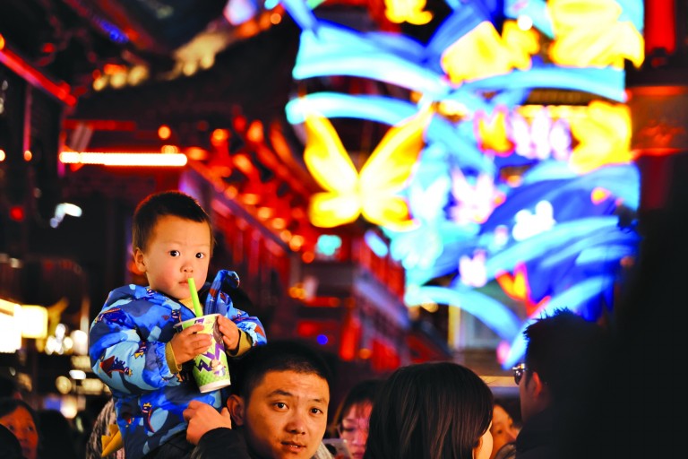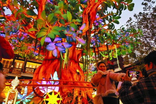 凝晖路今年依然是豫园灯会“最热打卡点”之一。茂密藤蔓环绕,无数色彩斑斓的蝴蝶自谷底向天空聚集,翩翩起舞,形成炫彩夺目的蝴蝶花海,从凝晖路一路走来,乘蝶以游,模糊了人与蝴蝶的界限,营造出“逍遥物外,庄周梦蝶”的梦境,达到“人在灯里游”的感受。