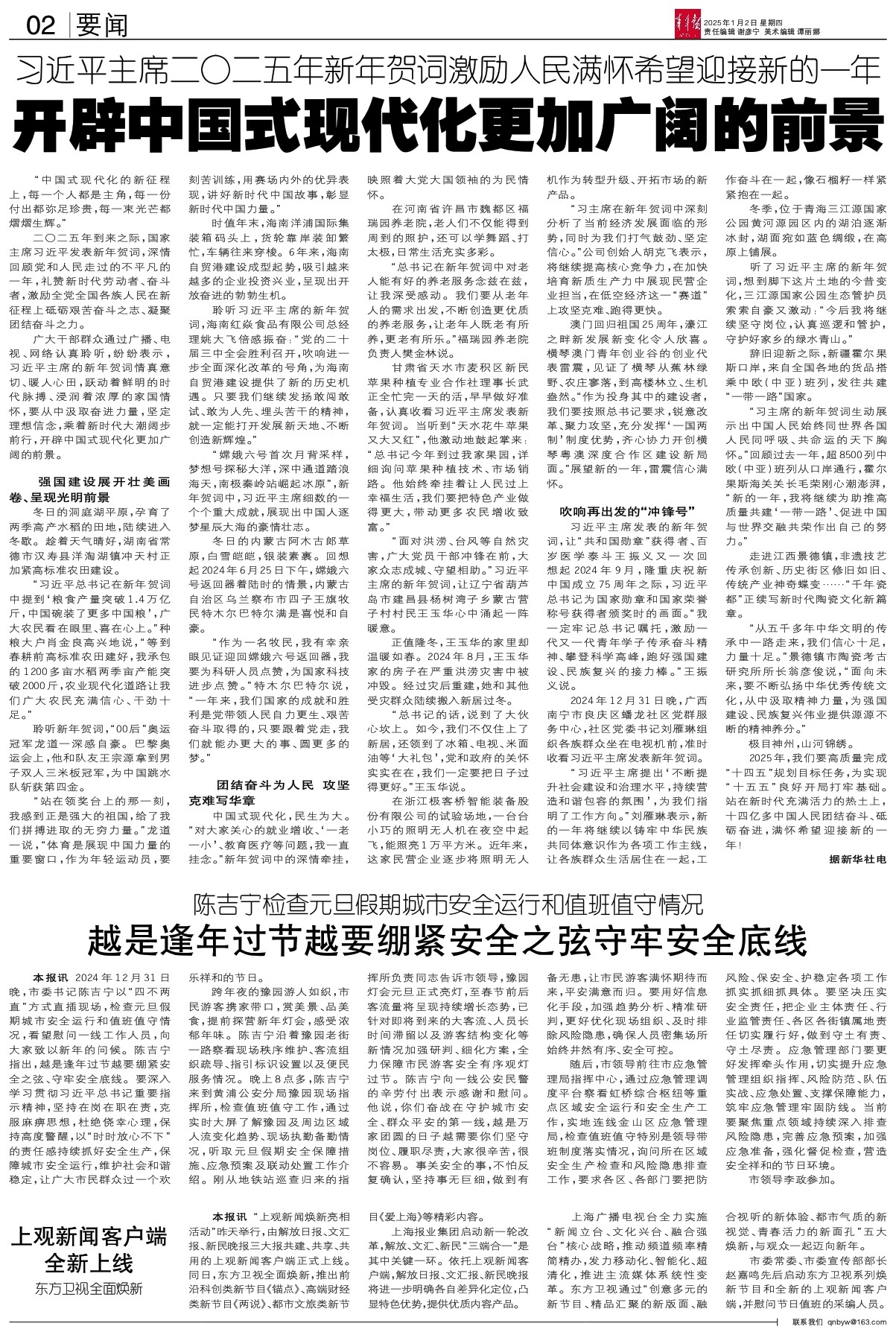 - 开辟中国式现代化更加广阔的前景 “中国式现代化的新征程上,每一个人都是主角,每一份付出都弥足珍贵,每一束光芒都熠熠生辉。” 二〇二五年到来之际,国家主席习近平发表新年贺词,深情回顾党和人民走过的不平凡的一年,礼赞