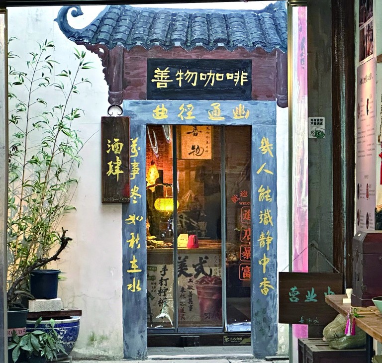 而善物坊后的咖啡厅“善物咖啡”,更是将古韵和今风混搭到底。中式的瓦砖房顶,牌匾上写“曲径通幽”,墙面贴有一张张书法遒劲的卡片,写“万事胜意”“奔赴山海”,极具古意,转身却见咖啡吧台,可点一杯拿铁,坐下来慢慢喝。实际上,这并不是泗泾古镇唯一一家咖啡厅。一尺花园、悦澜咖啡工坊,甚至星巴克,在古镇上,随处都可点一杯咖啡放松一下。