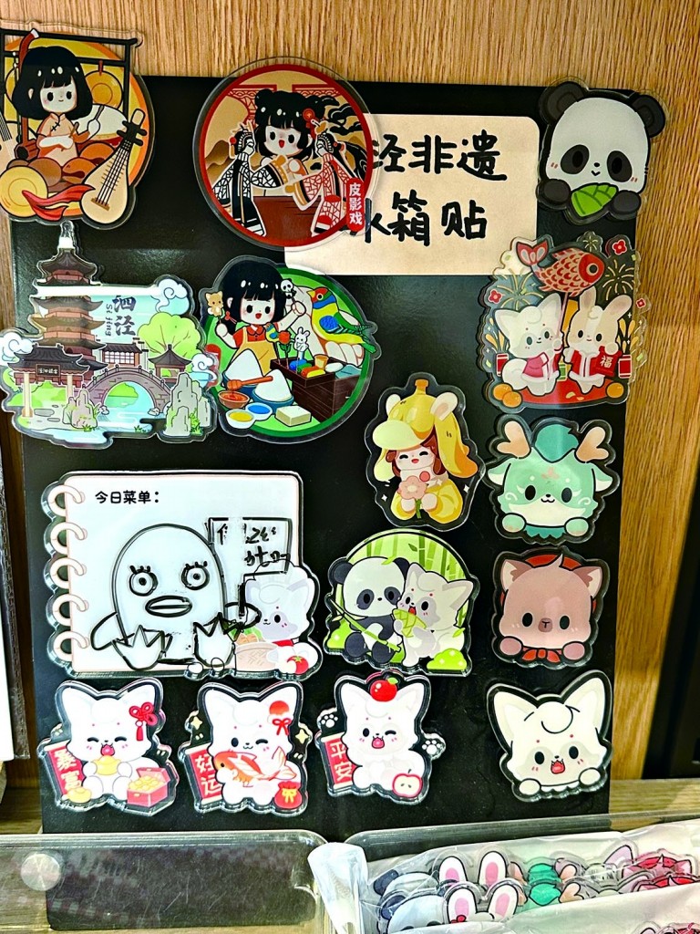 这一可爱、有趣的IP颇受年轻人欢迎。在小红书,月出狸拥有4.6万粉丝,线下的门店中也有不少年轻人逗留,购买文创。而月出狸艺术商店的许多文创都精心结合了古镇元素,比如“泗泾非遗冰箱贴”系列,泗泾标志性的安方塔,非遗技艺如皮影戏、十锦细锣鼓等都有所出现,月出狸穿着新年服装给大家拜年,画风可爱的女孩自己试着玩十锦细锣鼓,大家耳熟能详的非遗焕发出了新模样。