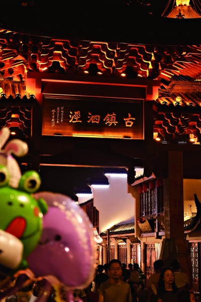漫步泗泾古镇,年味愈浓。街角撑起几根竹架,串上贴有福字的米黄色灯笼,红穗摇摆。竹架下摆上木凳,木凳放置虎虎生威的龙头。路灯下挂上小小红灯笼串,随风摇摆,夜晚灯火点亮,灯笼就越发惹人注目。
