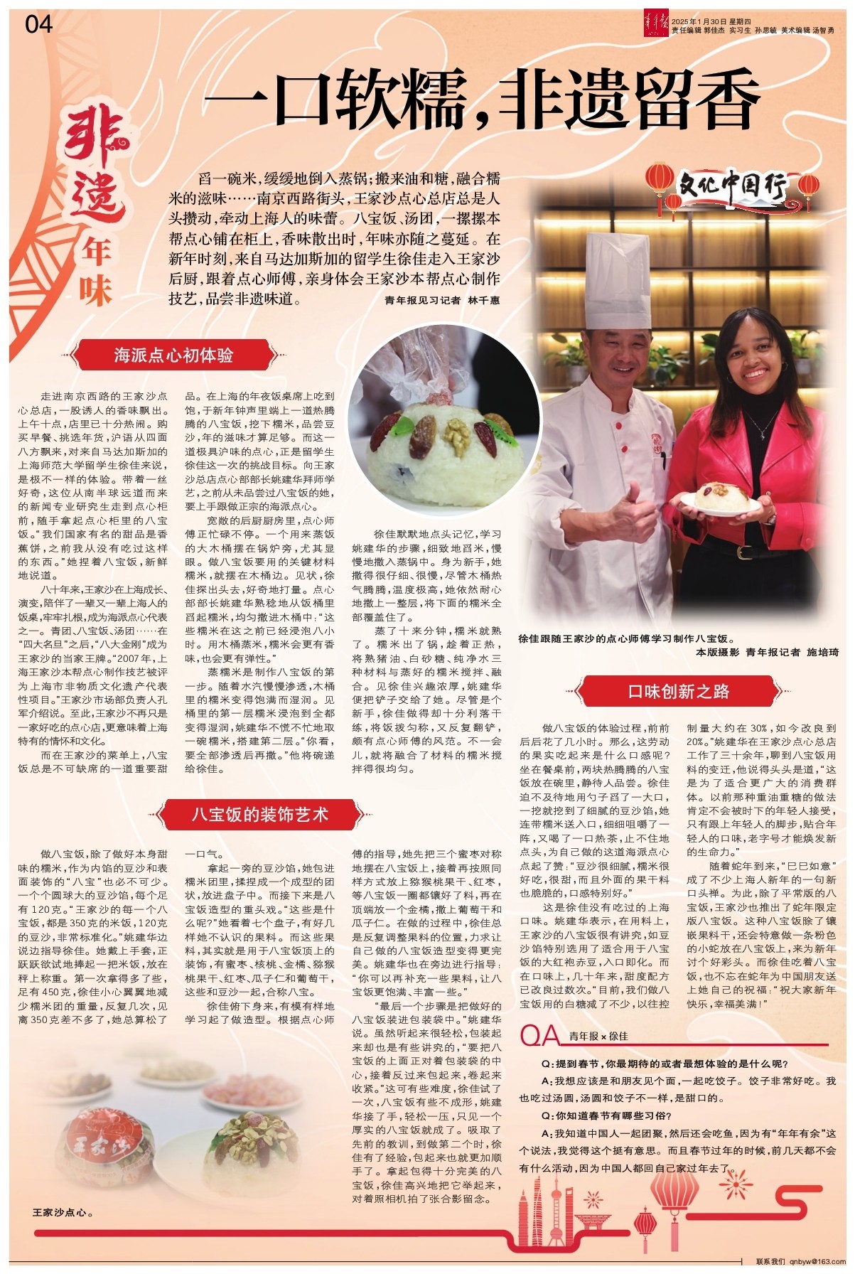 舀一碗米,缓缓地倒入蒸锅;搬来油和糖,融合糯米的滋味……南京西路街头,王家沙点心总店总是人头攒动,牵动上海人的味蕾。八宝饭、汤团,一摞摞本帮点心铺在柜上,香味散出时,年味亦随之蔓延。在新年时