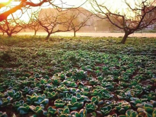 这种叫“新场青”的菜,俗称“矮脚青”。根据《新场镇志》记录,这种青菜植株矮且紧凑,具有较强的耐寒性,特别适宜秋冬季栽培。冬天桃树落叶了,每棵桃树下大概有4米见方的空地是闲置的,所以当地人就随手撒上种子,等着“矮脚青”长出来。闲暇之时,他们便前往地里采摘。采下的青菜,会有菜贩子前来收购,量少的则由他们自行拿到街上售卖。