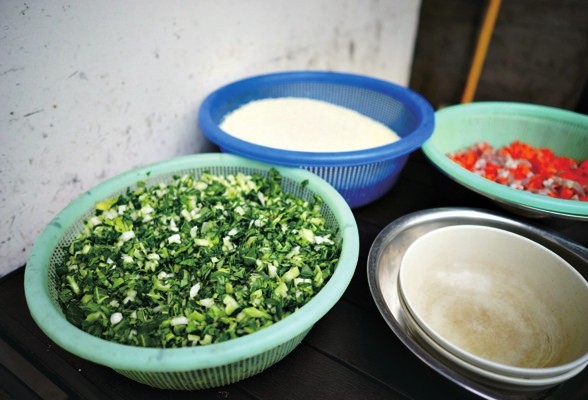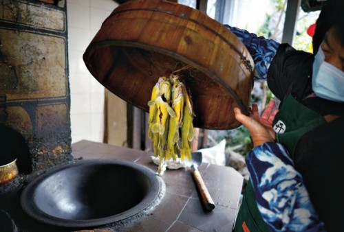 清晨,当第一缕阳光洒在新场古镇的青石板路上,李阿姨已经开始忙碌起来。“新场青”切碎,咸肉切块,洗米,杀鱼,腌鱼,再用棉线一条条串起。早上九点多,她已经完成了昂刺鱼菜饭的所有食材准备,等着上灶做饭。这家昂刺鱼菜饭店用的还是传统的土灶,烟火在上面刻下了时光的痕迹,不知究竟历经了多少个新春。