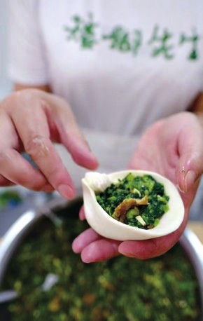 这份触动加之广告人的敏锐,让准备尝试农创的王峰打起了这些青菜的“主意”。了解“新场青”的历史后,王峰为“新场青”写了自传,结合新场的桃源特色,便有了“一棵交了桃花运的菜”。有漫画功底的他在“新场青”专属礼盒上绘制了图案,并写上了“来自新场,桃树下生长”,发往各地买家。他还在洪西街开了一间“矮脚先生包子铺”,主打用当地青菜做的净素包子。