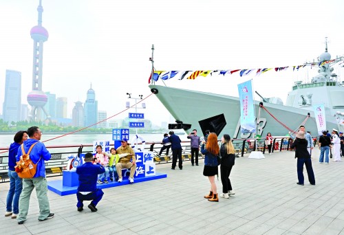 四月的上海,烟雨朦胧的浦江两岸绿意盎然,春风带动旗帜飞扬、浪花翻涌,发出欢呼的“掌声”。4月22日,在人民海军成立76周年之际,驻沪海军部队联合上海市双拥办共同组织以“上海·海上”为主题的舰艇开放活动。导弹驱逐舰西安舰和综合登陆舰沂蒙山舰停驻上海港国际客运中心码头,迎接社会各界民众登舰参观。