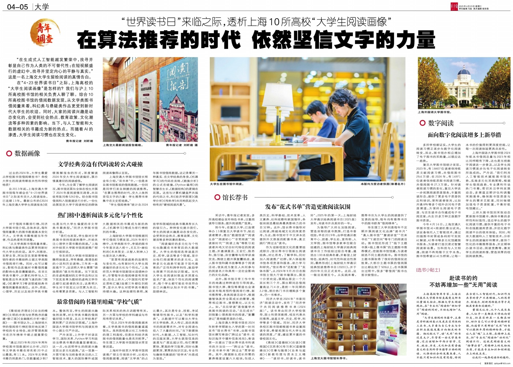“在生成式人工智能越发繁荣中,找寻并彰显自己作为人类的不可替代性;在短视频盛行的虚幻中,找寻并坚定内心的平静与真实。”这是一名上海交大学生留给阅读的真情告白。 在“4·23世界读书