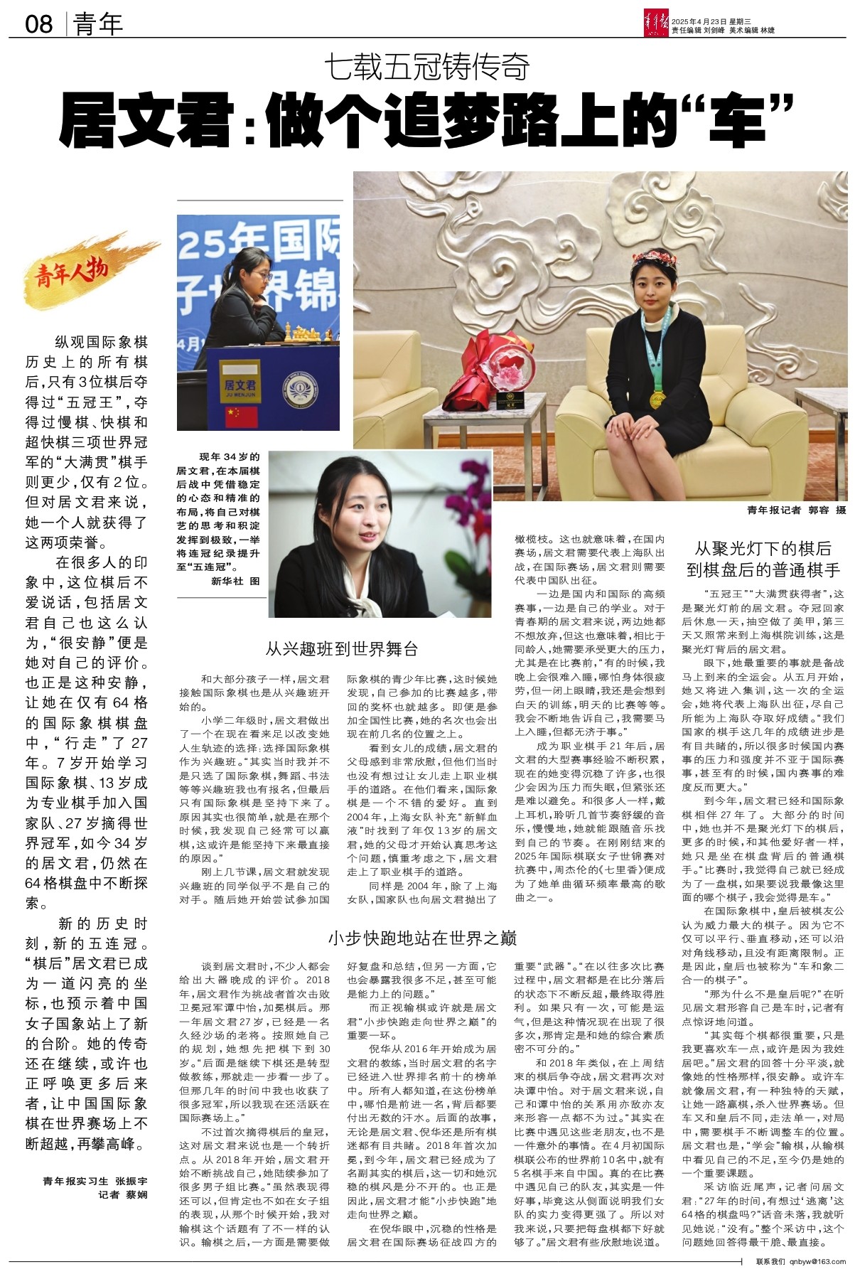 纵观国际象棋历史上的所有棋后,只有3位棋后夺得过“五冠王”,夺得过慢棋、快棋和超快棋三项世界冠军的“大满贯”棋手则更少,仅有2位。但对居文君来说,她一个人就获得了这两项荣誉。 在很