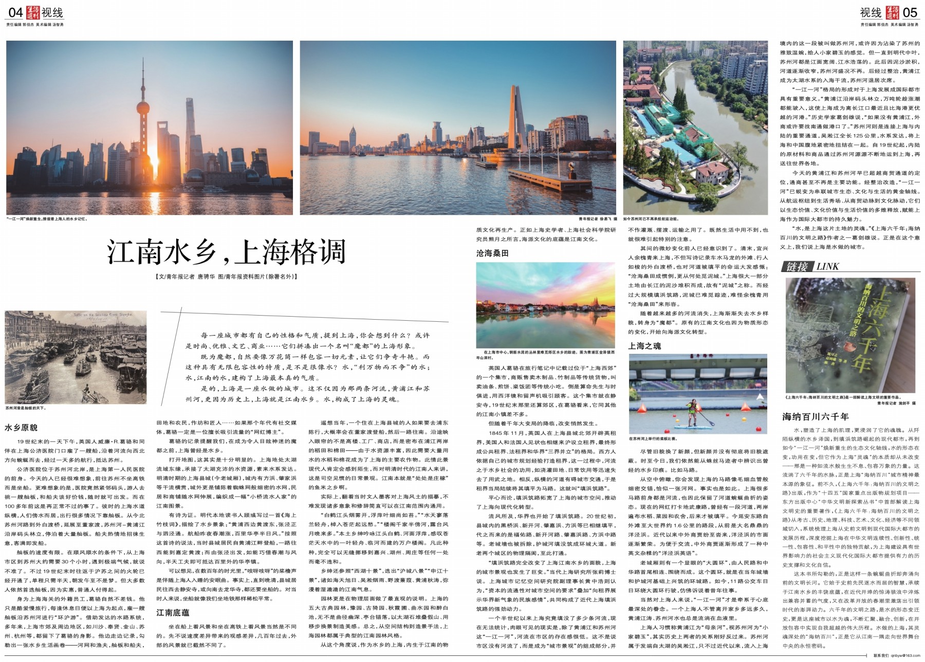 “水,是上海这片土地的灵魂。”《上海六千年:海纳百川的文明之路》作者之一葛剑雄说。正是在这个意义上,我们说上海是水做的城市。