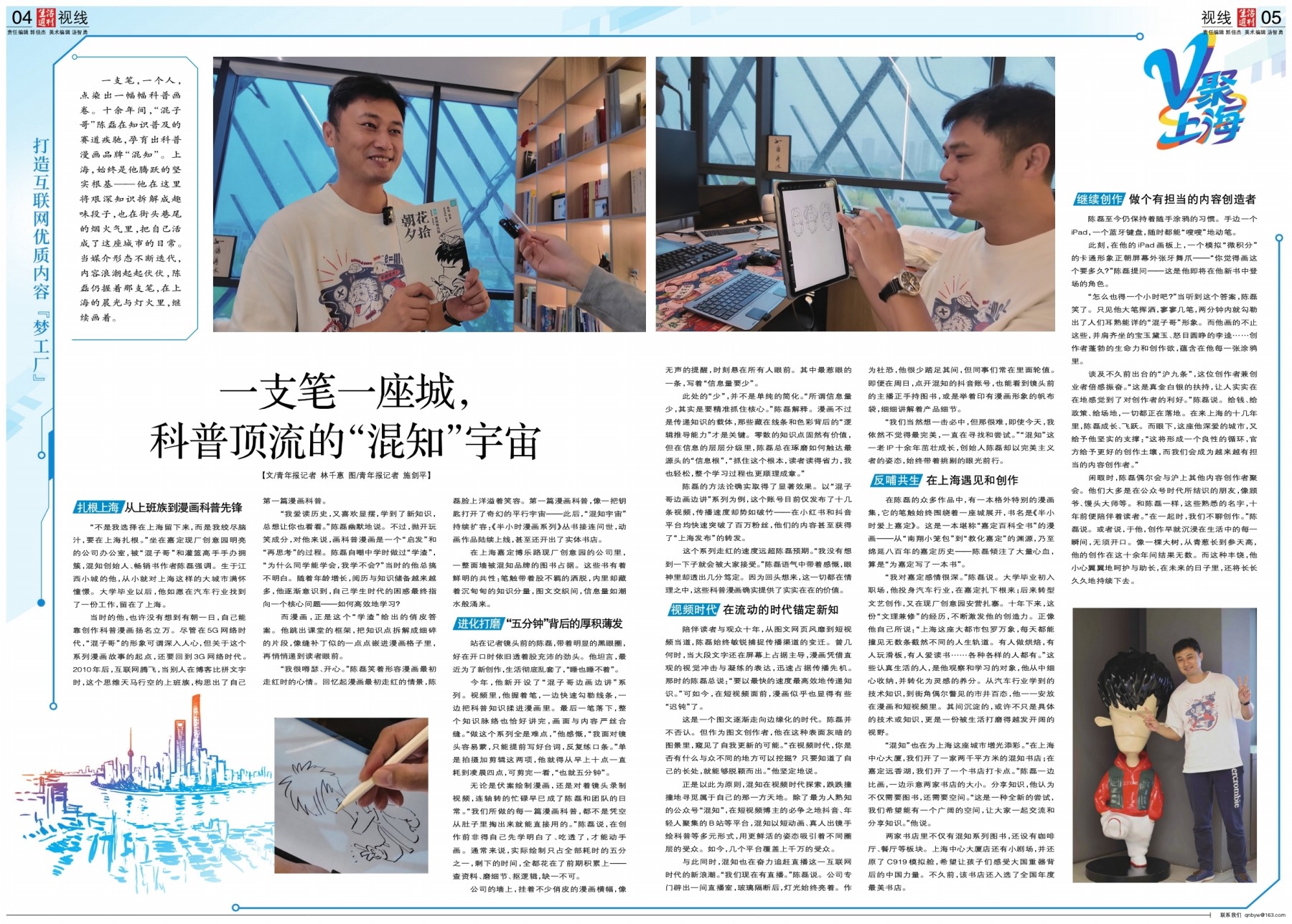 【文/青年报记者 林千惠 图/青年报记者 施剑平】 一支笔,一个人,点染出一幅幅科普画卷。十余年间,“混子哥”陈磊在知识普及的赛道疾驰,孕育出科普漫画品牌“混知”。上海,始终是他腾
