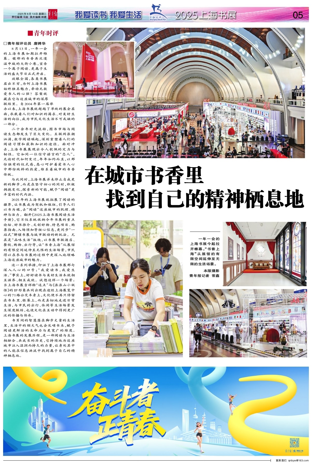 □青年报评论员 唐骋华 8月13日,一年一会的上海书展如期拉开帷幕。馥郁的书香再次漫溢申城的大街小巷,宣告一个属于阅读、更属于生活的盛大节日正式开启。 放眼全国,各类书展