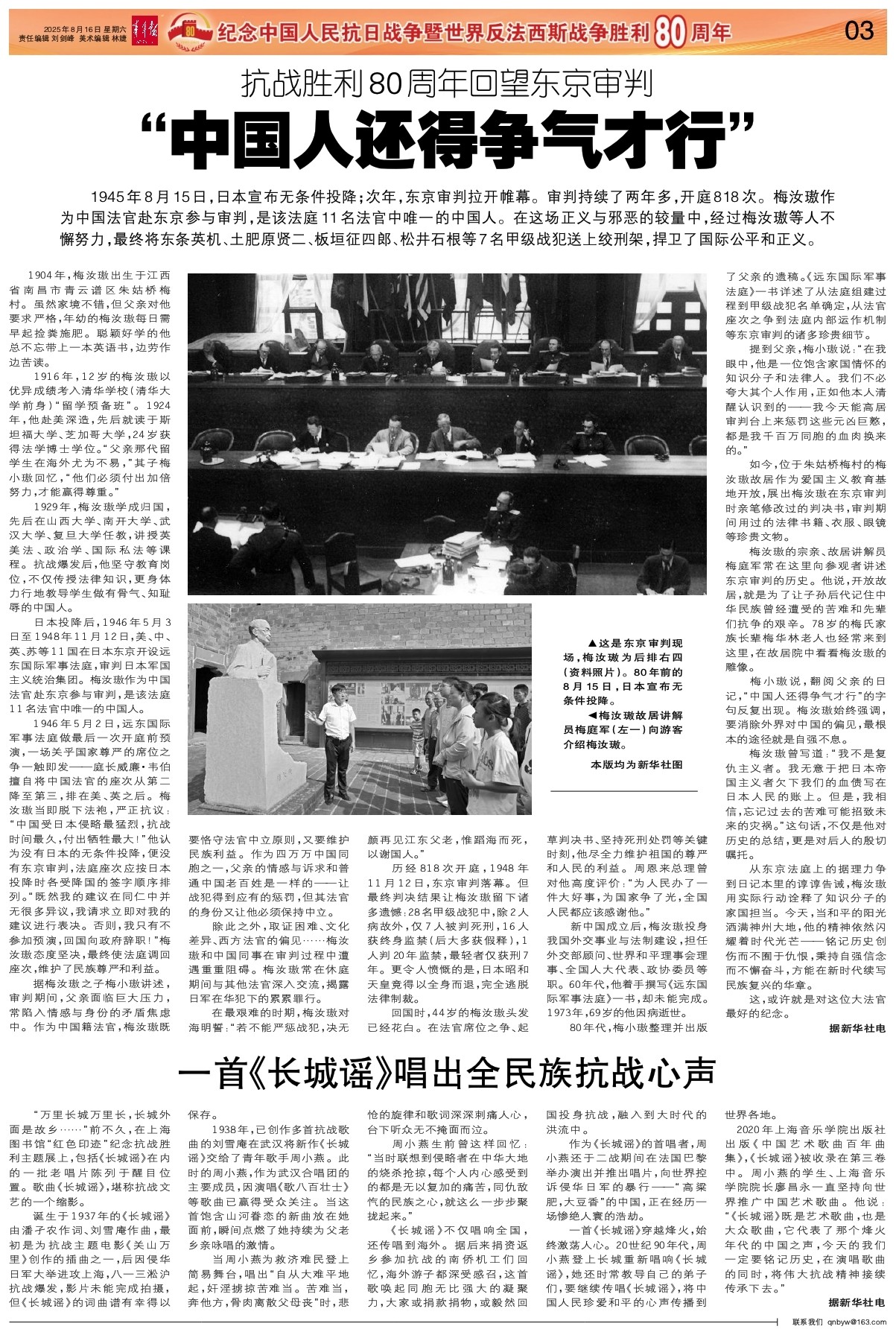 - “中国人还得争气才行” 1945年8月15日,日本宣布无条件投降;次年,东京审判拉开帷幕。审判持续了两年多,开庭818次。梅汝璈作为中国法官赴东京参与审判,是该法庭11名法官中唯一的中国人。在这场正义与邪恶的较量中