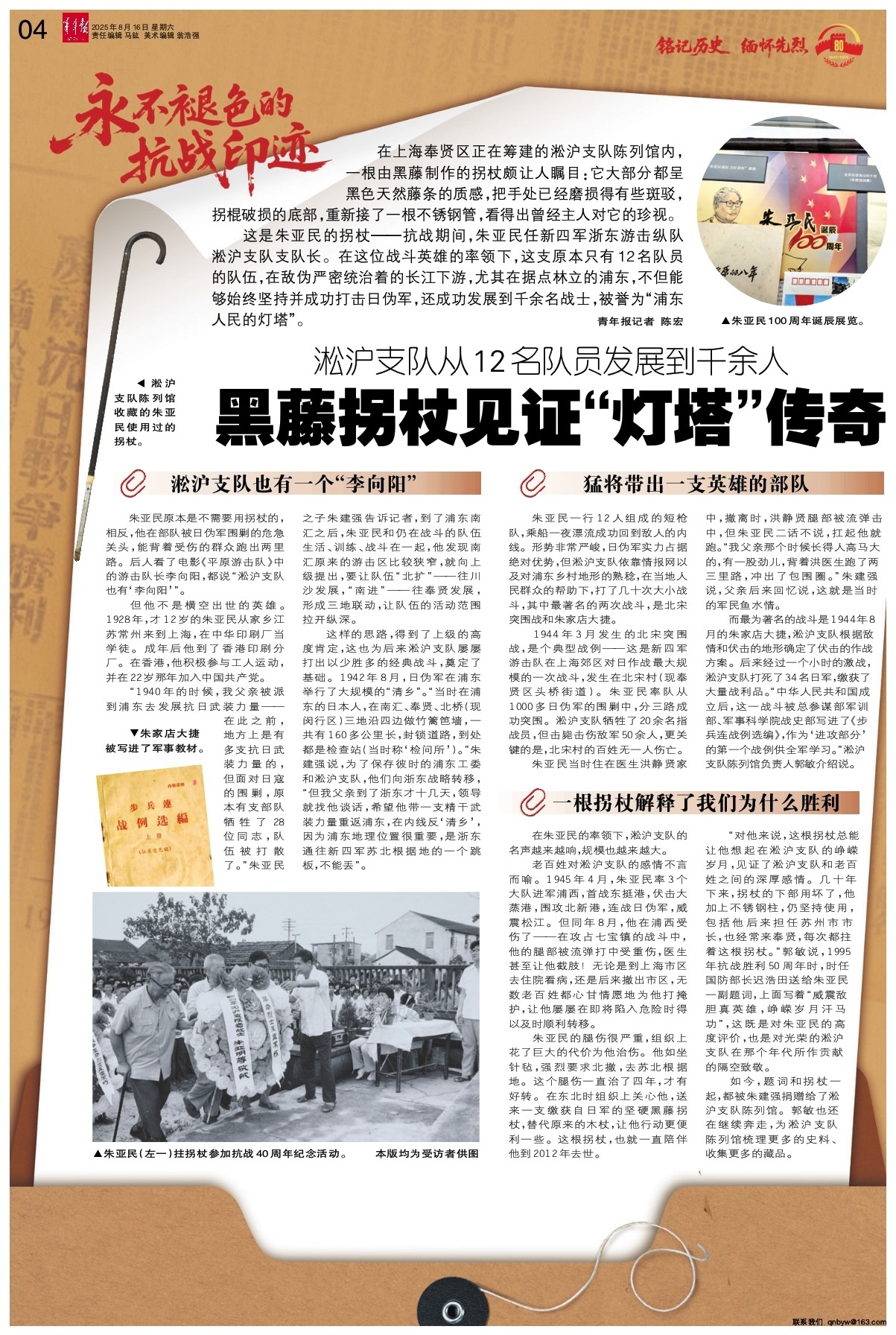 在上海奉贤区正在筹建的淞沪支队陈列馆内,一根由黑藤制作的拐杖颇让人瞩目:它大部分都呈黑色天然藤条的质感,把手处已经磨损得有些斑驳,拐棍破损的底部,重新接了一根不锈钢管,看得出曾经主人对它的珍