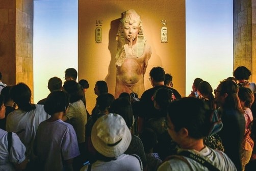 据上海博物馆昨日公布的数据,展览累计接待观众总数2777966人次,一举刷新全球博物馆单个收费特展参观人数的纪录。其中,近七成观众来自外省市,外埠观众中逾七成为本次特展专程来沪。展览总营收超7.6亿元,其中门票收入超3.2亿元,文创活动及周边衍生产品收入超4.4亿元。展览共推出1200余款文创产品,销售总量超300万件,开展文创活动近500场,覆盖观众近30万人次。专业机构统计分析报告显示,埃及展拉动城市消费比例达1:48,带动城市综合消费超过350亿元,成为“一个展激活一座城”的生动写照。另因受展览持续火爆的带动,埃及旅游和文物部表示,埃及入境游中国游客数量同比增长65%。