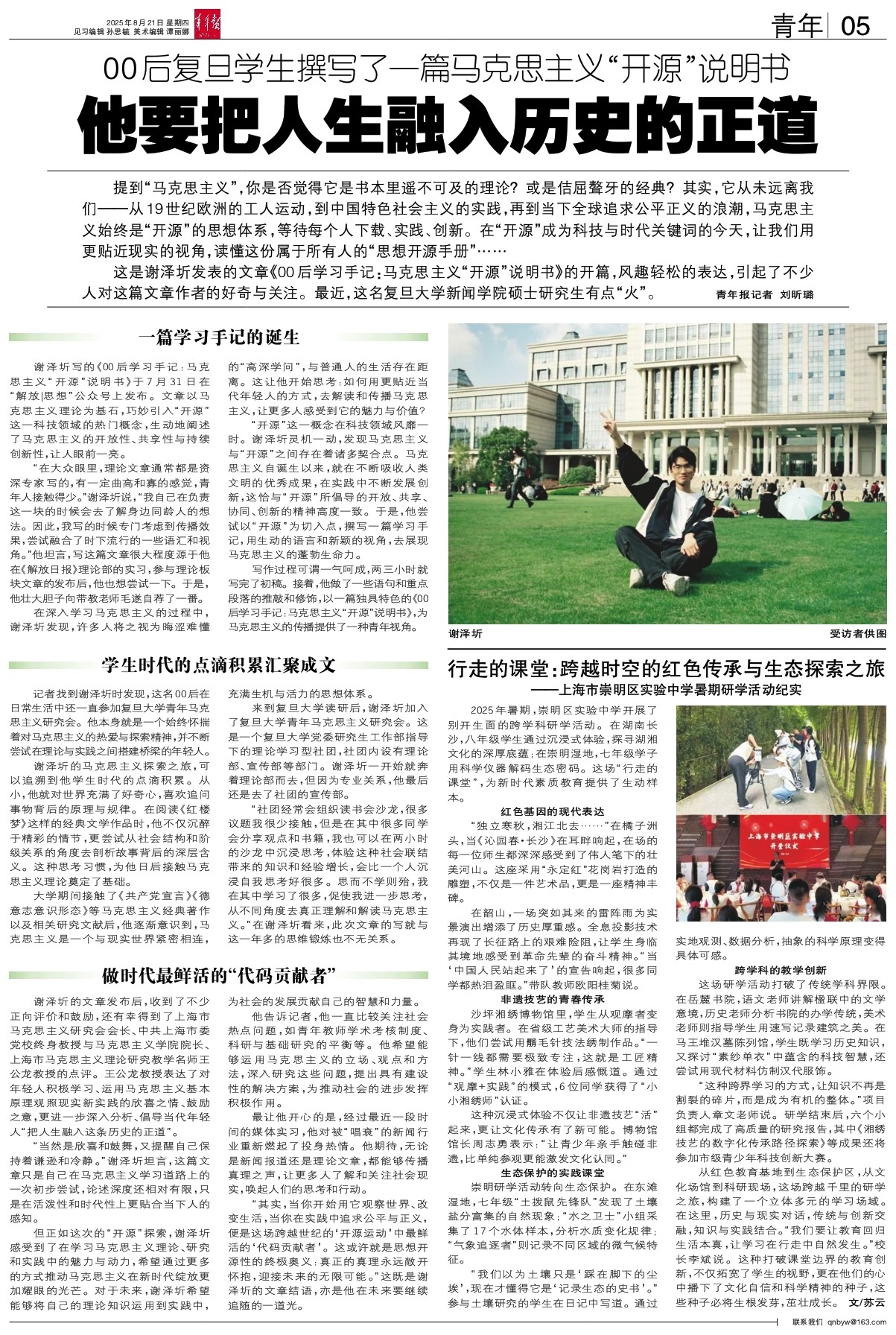 记者找到谢泽圻时发现,这名00后在日常生活中还一直参加复旦大学青年马克思主义研究会。他本身就是一个始终怀揣着对马克思主义的热爱与探索精神,并不断尝试在理论与实践之间搭建桥梁的年轻人。