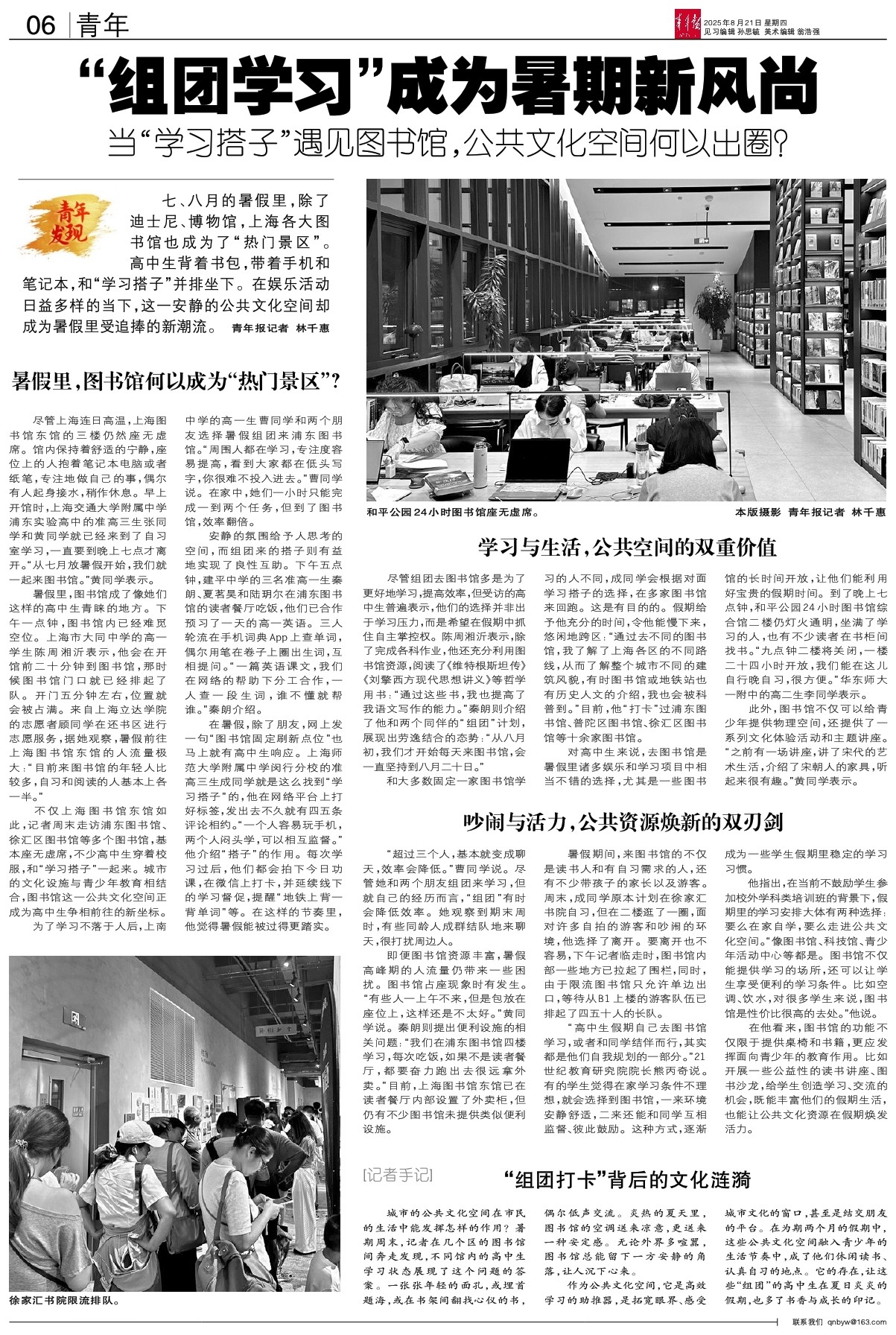 七、八月的暑假里,除了迪士尼、博物馆,上海各大图书馆也成为了“热门景区”。高中生背着书包,带着手机和笔记本,和“学习搭子”并排坐下。在娱乐活动日益多样的当下,这一安静的公共文化空间却成为暑假