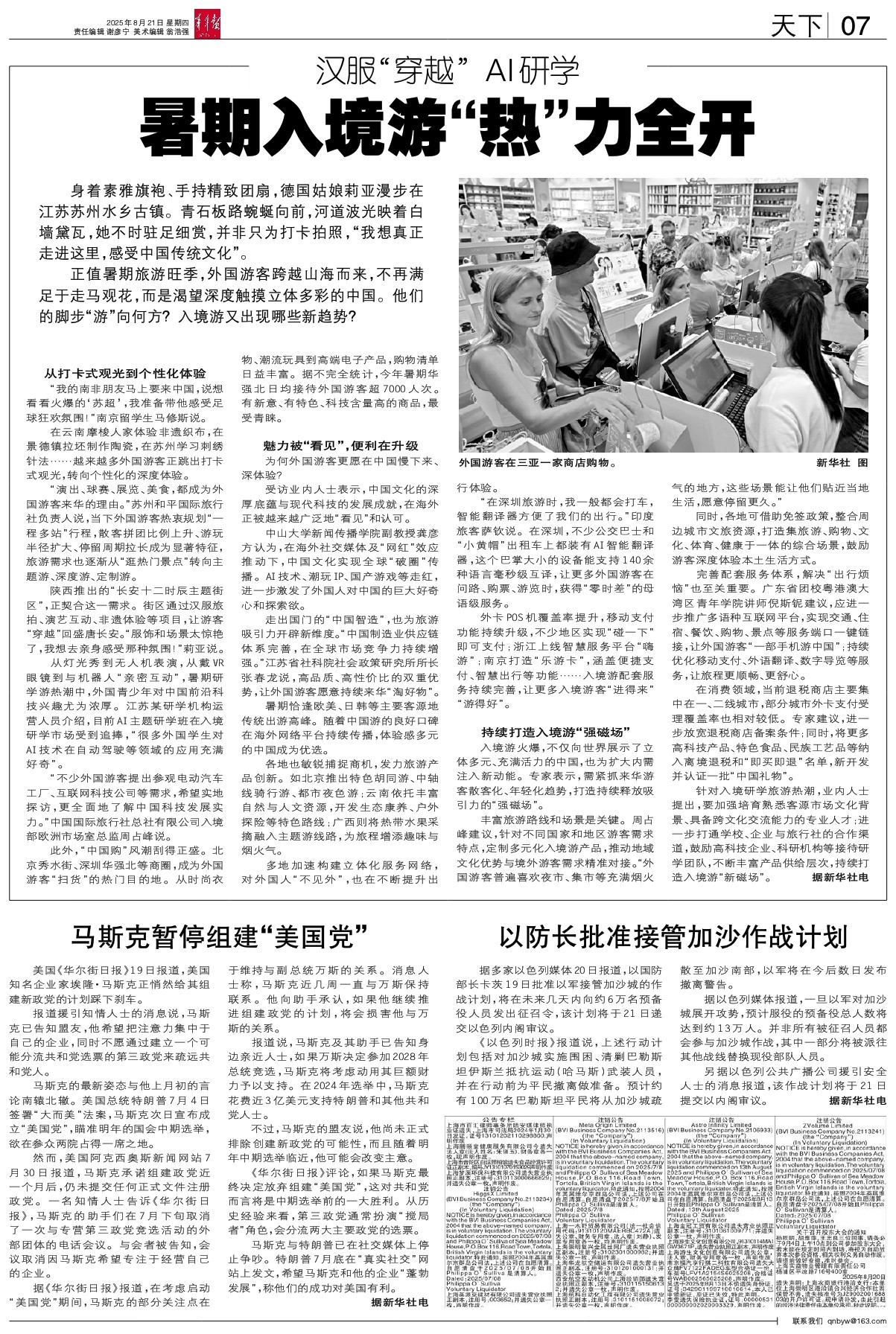 - 暑期入境游“热”力全开 身着素雅旗袍、手持精致团扇,德国姑娘莉亚漫步在江苏苏州水乡古镇。青石板路蜿蜒向前,河道波光映着白墙黛瓦,她不时驻足细赏,并非只为打卡拍照,“我想真正走进这里,感受中国传统文化”。