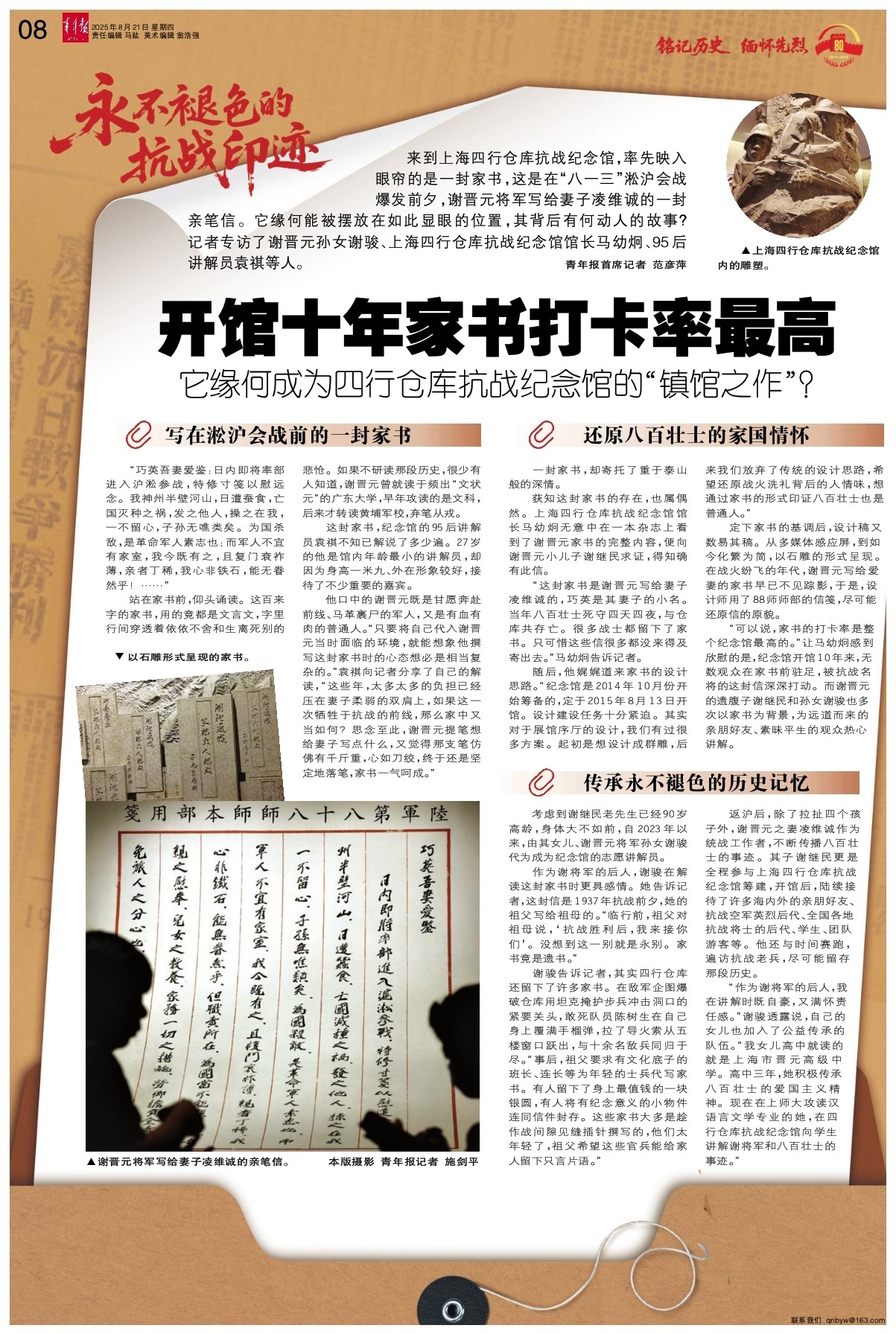 来到上海四行仓库抗战纪念馆,率先映入眼帘的是一封家书,这是在“八一三”淞沪会战爆发前夕,谢晋元将军写给妻子凌维诚的一封亲笔信。它缘何能被摆放在如此显眼的位置,其背后有何动人的故事?记者专访了