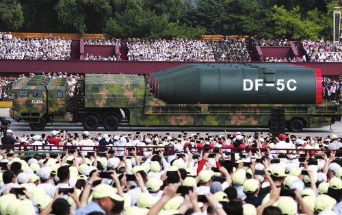 12台大型导弹运输车载着“东风-5C”液体洲际战略核导弹浩荡而来。核导弹第二方队是装备方队压轴出场的方队。