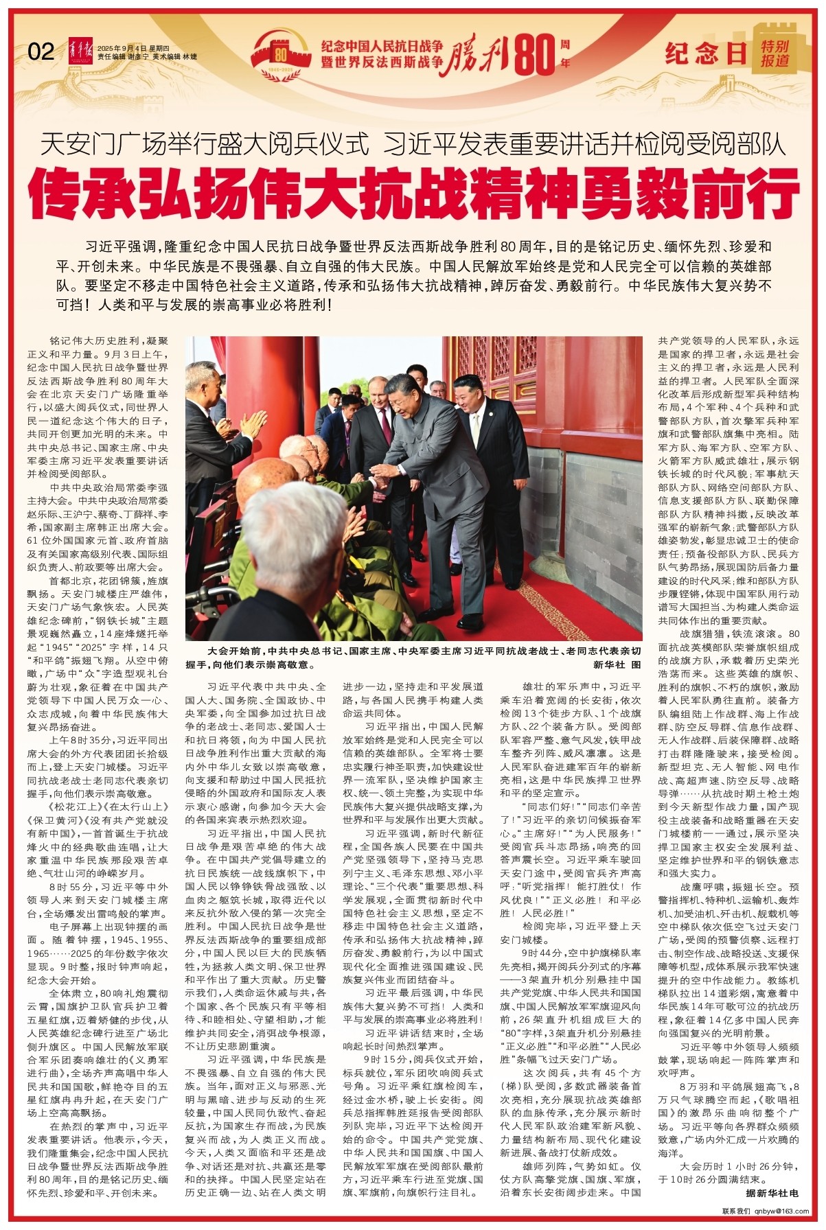习近平强调,隆重纪念中国人民抗日战争暨世界反法西斯战争胜利80周年,目的是铭记历史、缅怀先烈、珍爱和平、开创未来。中华民族是不畏强暴、自立自强的伟大民族。中国人民解放军始终是党和人民完全可以