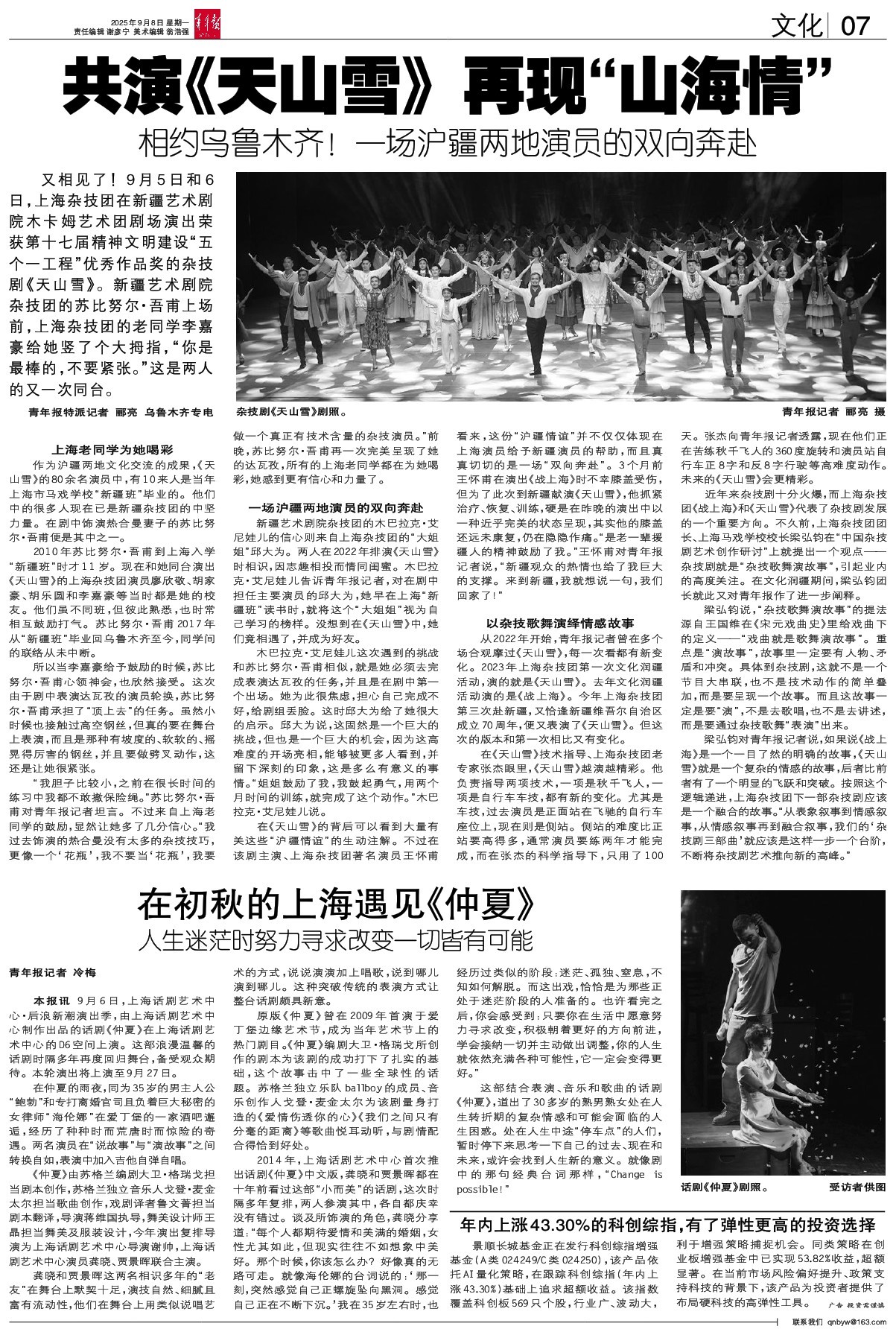 - 共演《天山雪》再现“山海情” 又相见了!9月5日和6日,上海杂技团在新疆艺术剧院木卡姆艺术团剧场演出荣获第十七届精神文明建设“五个一工程”优秀作品奖的杂技剧《天山雪》。新疆艺术剧院杂技团的苏比努尔·吾甫上场前,上海杂技团