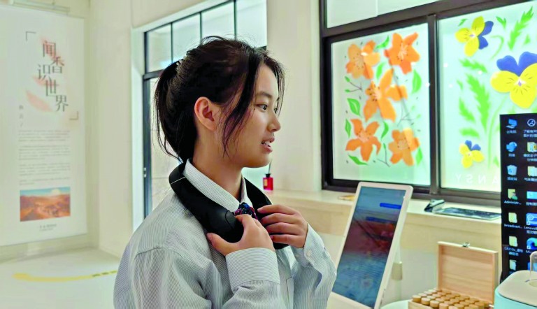 奉城高级中学高二学生高安琪担任展区讲解员,她佩戴上脖戴式气味播放器,当电视画面依次出现巧克力、冰淇淋、白酒、薄荷、川味火锅、溪边花香水等意象时,气味播放器上的小孔便开始精准控制微气流,散发气味。她十分期待,未来可以常来体验和探索。