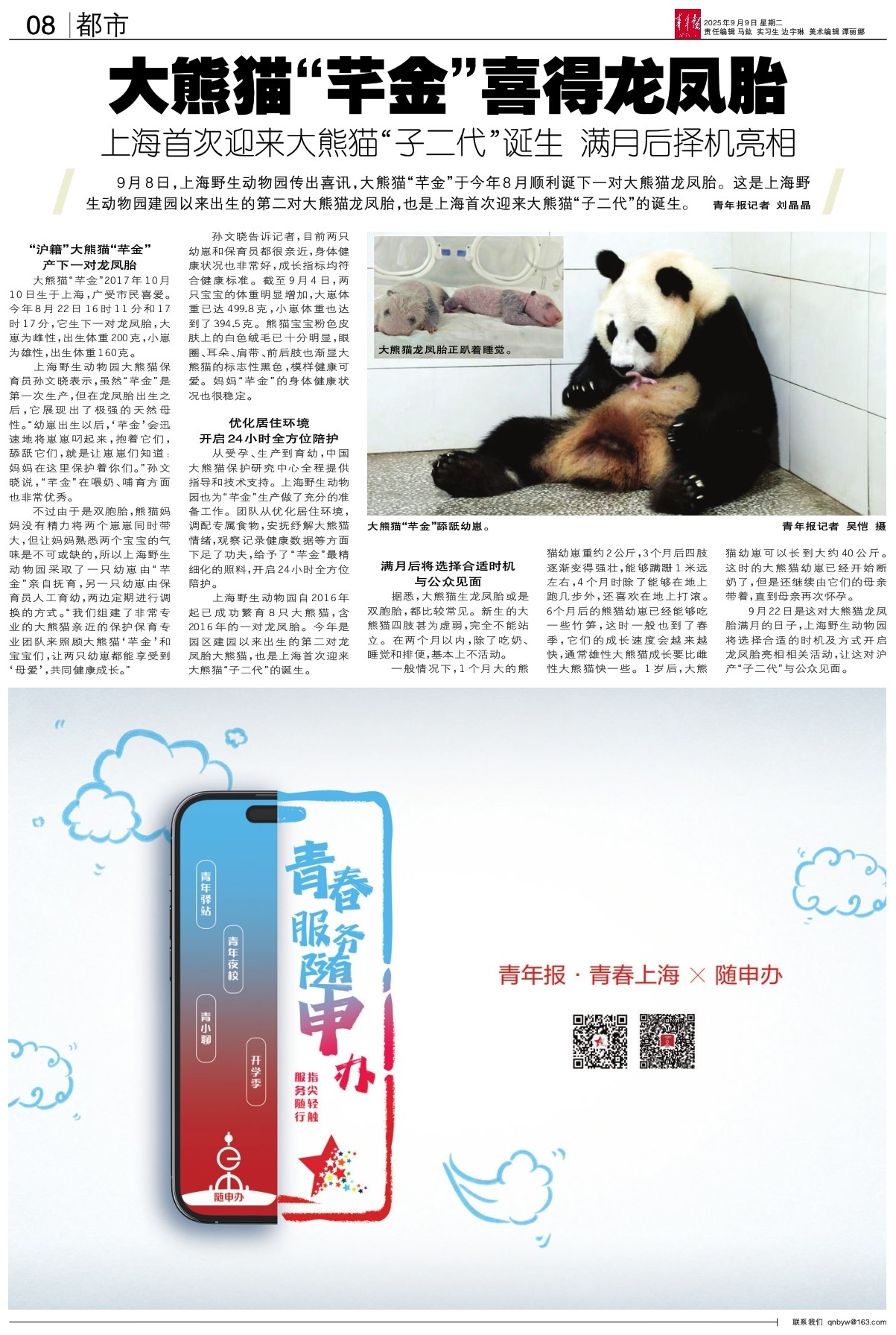 9月8日,上海野生动物园传出喜讯,大熊猫“芊金”于今年8月顺利诞下一对大熊猫龙凤胎。这是上海野生动物园建园以来出生的第二对大熊猫龙凤胎,也是上海首次迎来大熊猫“子二代”的诞生。 青
