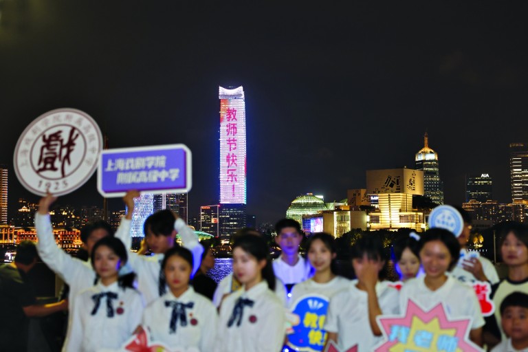 本报讯 “老师,您好!”“老师,您辛苦了!”“教师节快乐!”9月9日晚,在第41个教师节来临之际,位于黄浦江边的震旦大厦、花旗大厦、白玉兰广场等楼体大屏同时点亮,滚动播放“以教育家精神铸魂强师,谱写教育强国建设华章”“奋进教育路,唱响强国志”等标语,向广大教师致以崇高敬意,大力弘扬尊师重教的社会风尚。