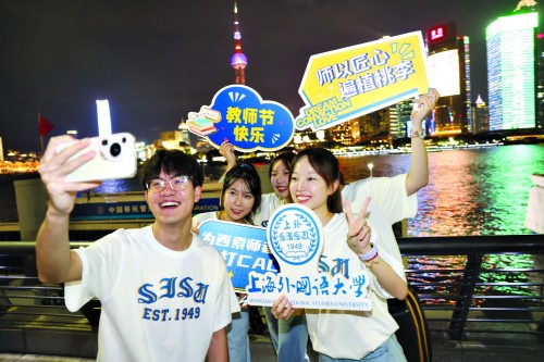 本报讯 “老师,您好!”“老师,您辛苦了!”“教师节快乐!”9月9日晚,在第41个教师节来临之际,位于黄浦江边的震旦大厦、花旗大厦、白玉兰广场等楼体大屏同时点亮,滚动播放“以教育家精神铸魂强师,谱写教育强国建设华章”“奋进教育路,唱响强国志”等标语,向广大教师致以崇高敬意,大力弘扬尊师重教的社会风尚。