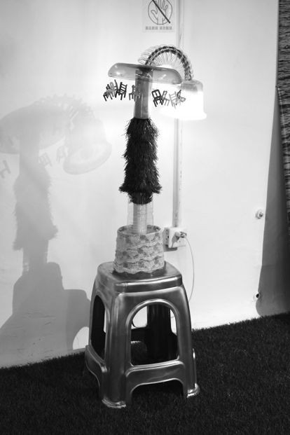 那盏被观众牢牢记住的台灯,如今就在郑野许的工作室里。它创作于广东广州,没人能想到,它的雏形是一根从朋友那里拿来的弯管水龙头;它的底座原本是一张再普通不过的红色塑料凳——被网友调侃为“广东省凳”——被刷上银色涂料后重获新生;而其他材料则是各种捡来的废旧物。改造中最难的是拆解水龙头的接头,郑野许买了很多工具,一点点摸索,才把它切断。“去学习使用工具,然后最终达成自己的效果也是很好玩的。”她说。