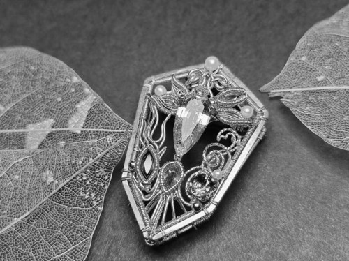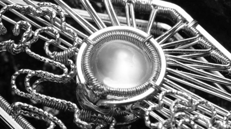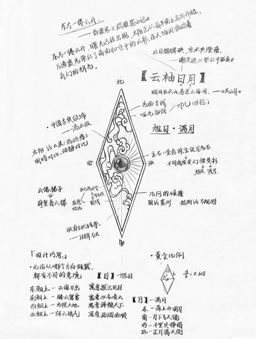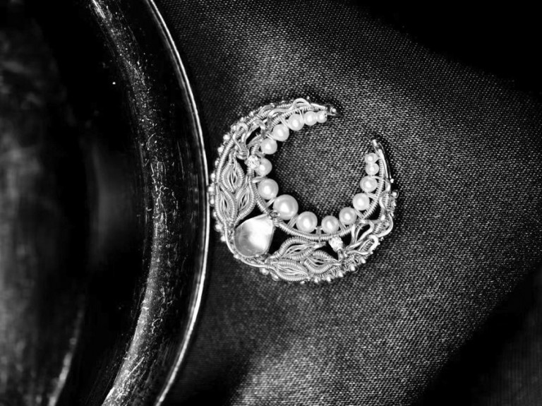 她的原创古典纹饰绕线作品《出袖日月》,“出袖”语出陶渊明“云无心以出岫”,有将日月光华拢入袖中之意。主石采用珠宝级月光石,从不同角度变幻出橙黄色彩,对应旭日与满月。然后将金色批花线缠绕成纹饰,形成动静对比。“纹饰源于宋徽宗《瑞鹤图》中的流云纹,流动飘散,富有灵性。”刘昱辰还特地设计成胸针、吊坠两用款,有不同意境。