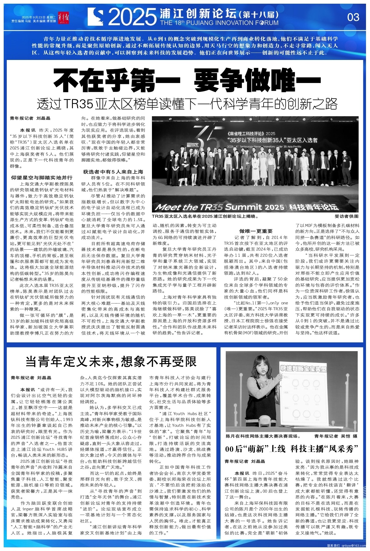 - 不在乎第一 要争做唯一 青年报记者 刘晶晶 本报讯 昨天,2025年度“35岁以下科技创新35人”(简称“TR35”)亚太区入选名单在2025浦江创新论坛上揭晓,其中上海获奖者有5人。他们展现的,正是下一