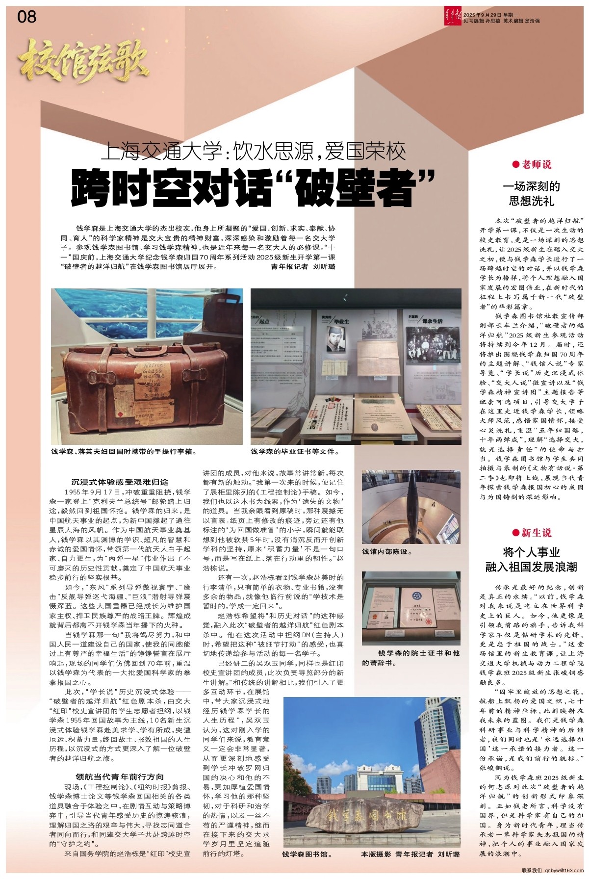 钱学森是上海交通大学的杰出校友,他身上所凝聚的“爱国、创新、求实、奉献、协同、育人”的科学家精神是交大宝贵的精神财富,深深感染和激励着每一名交大学子。参观钱学森图书馆、学习钱学森精神,也是近