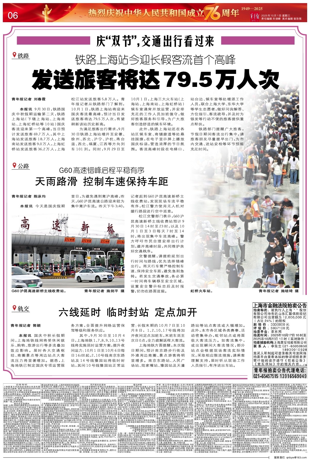 - 六线延时 临时封站 定点加开 青年报记者 郭颖 本报讯 国庆中秋长假期间,上海地铁线网将受休闲娱乐、购物、旅游出行等多流叠加效应影响。届时各大交通枢纽、商圈景点等周边站点大客流压力将显著增加。据悉,上海地铁已制
