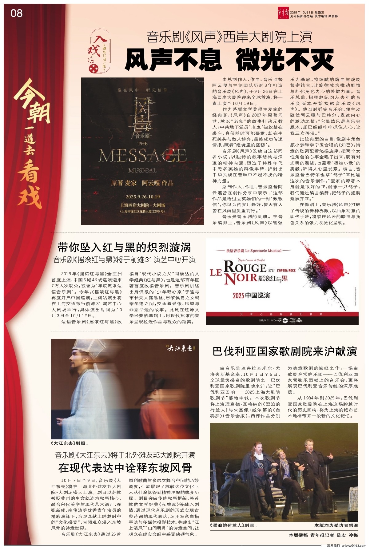 - 在现代表达中诠释东坡风骨 10月7日至9日,音乐剧《大江东去》将在上海北外滩友邦大剧院·大剧场盛大上演。剧目以苏轼被贬黄州的生命轨迹为叙事核心,融合宋代美学与现代艺术语汇,在张新成、宗俊涛等优秀青年演员的精彩演绎下,