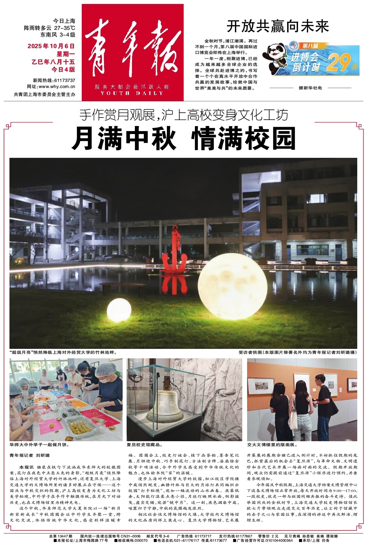 本报讯 糖浆在铁勺下流淌成华东师大的校徽图案,花灯在夜色中点亮玉兔的身影,“超级月亮”悄然降临上海对外经贸大学的竹林池畔,还有复旦大学、上海交通大学的文博场所里的诸多好展正在守候——这个国庆与中秋交织的假期,沪上高校变身为文化工坊与美学秘境,中外学子在手作中触摸传统,在月光下对话历史,也在文博场馆里为精神充电。