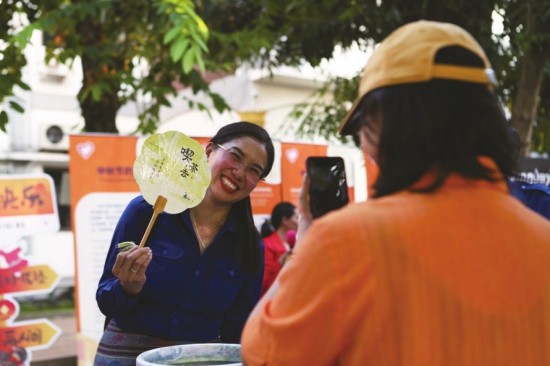 在“月满华夏·共话神话”的小游戏中,志愿者介绍了“嫦娥奔月”等与月亮相关的中国神话传说以及中国关于中秋节的传统习俗。参加活动的老挝青少年用中文或者英文复述中国故事或习俗,便可获得一枚盖章。在“团圆美满”非遗漆团扇制作体验中,参与者可以使用漆艺材料绘制团扇扇面,制作属于自己的中秋“团圆扇”。