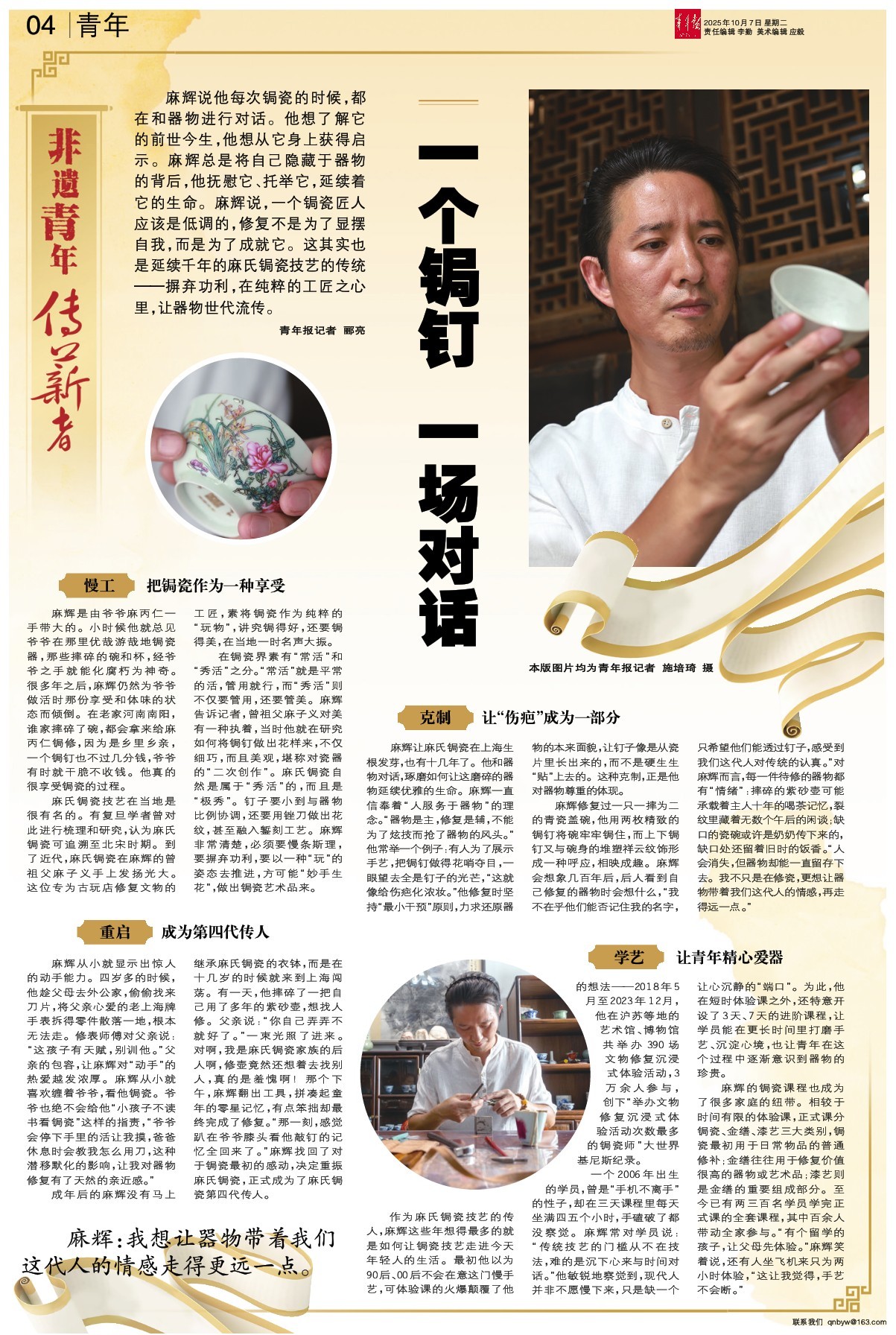 麻辉说他每次锔瓷的时候,都在和器物进行对话。他想了解它的前世今生,他想从它身上获得启示。麻辉总是将自己隐藏于器物的背后,他抚慰它、托举它,延续着它的生命。麻辉说,一个锔瓷匠人应该是低调的,修
