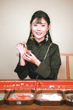 课余时间,张佳慧总喜欢往学校里的大师工作室跑,银饰、玉雕、漆艺、刺绣……每打开一扇门便是一条通往非遗世界的道路,她从那些独到的创意和精湛的技法中感受大师对工艺美术发展的深刻理解,以及他们用自己的创作作出新的诠释。带着非遗创新作品,她参加各类创业大赛,频频斩获大奖,并在毕业那年创办了珠宝公司,以非遗工艺结合当代设计,打造独一无二的金银细工(花丝镶嵌工艺)首饰。花丝镶嵌可以说是珠宝工艺界的活化石,所谓“花丝万缕织金冠,妙手镶嵌有乾坤”,正是对这项精妙工艺的高度概括。“一开始,我只售卖自己做的首饰,后来,我将自己喜爱的大师的作品也纳入其中,半学期下来,销售总额逾50万元,这也是我第一次直接从市场端感受到人们对非遗的认可和喜爱。”张佳慧说。