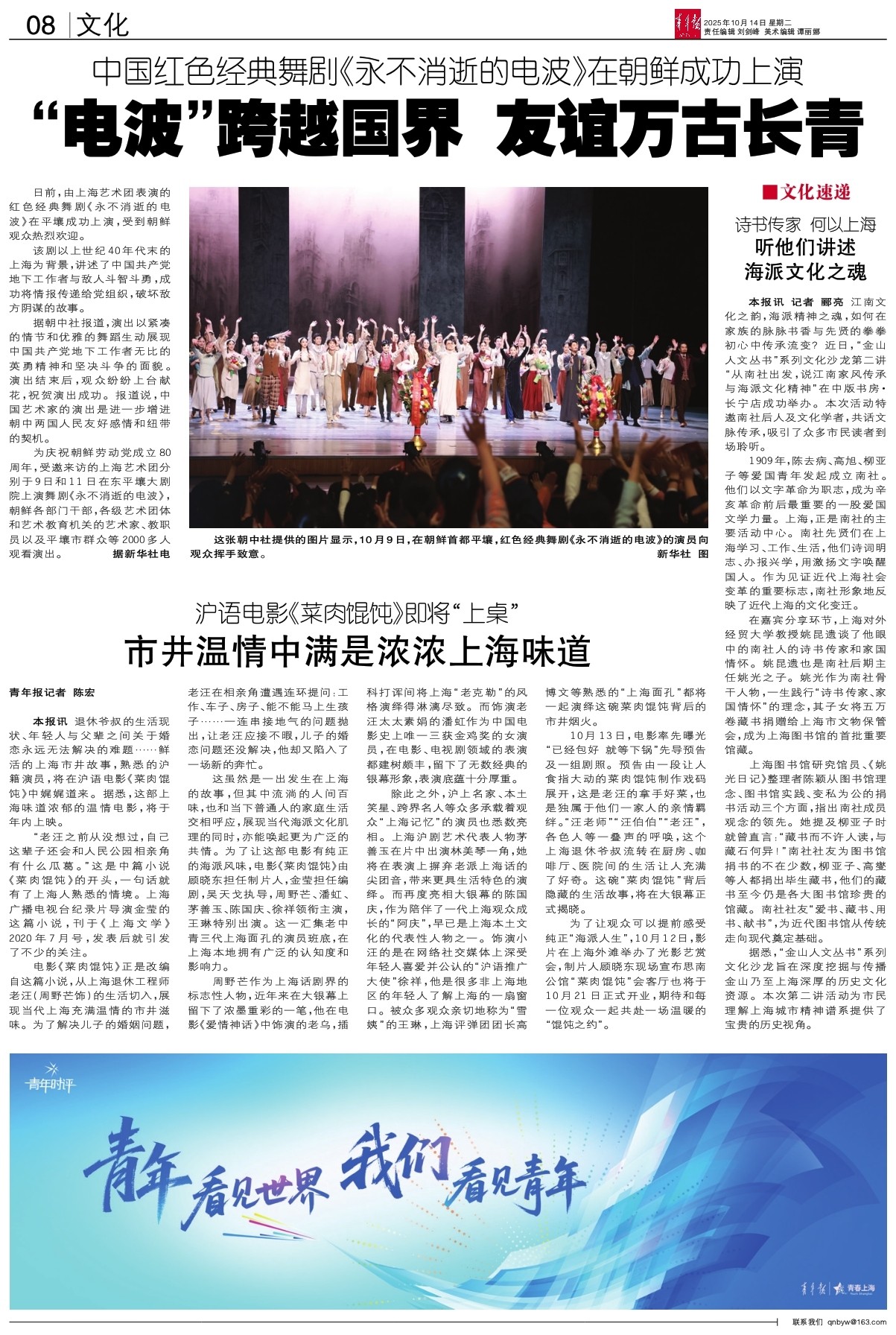 - “电波”跨越国界 友谊万古长青 日前,由上海艺术团表演的红色经典舞剧《永不消逝的电波》在平壤成功上演,受到朝鲜观众热烈欢迎。 该剧以上世纪40年代末的上海为背景,讲述了中国共产党地下工作者与敌人斗智斗勇,成功将情