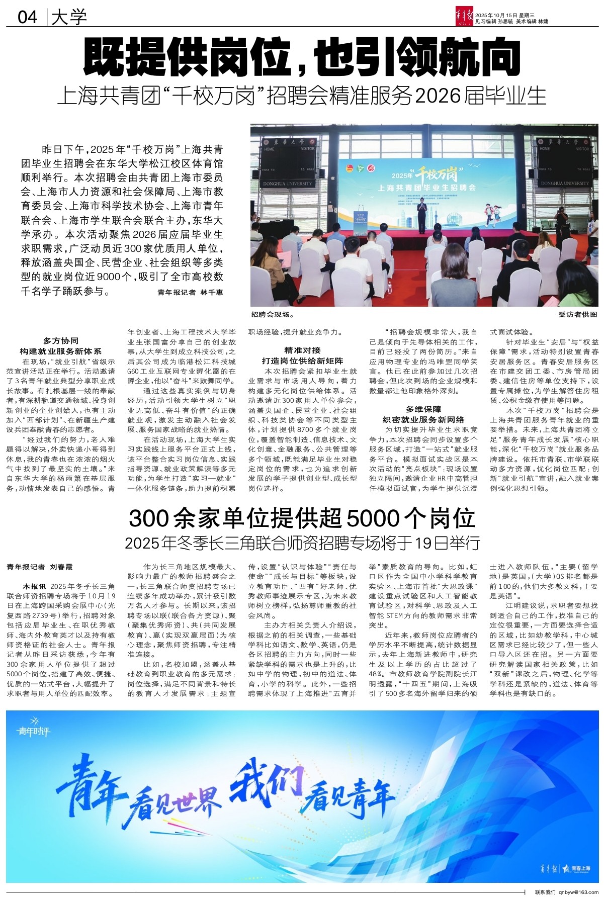青年报记者 刘春霞 本报讯 2025年冬季长三角联合师资招聘专场将于10月19日在上海跨国采购会展中心(光复西路2739号)举行,招聘对象包括应届毕业生、在职优秀教师、海内外教育英