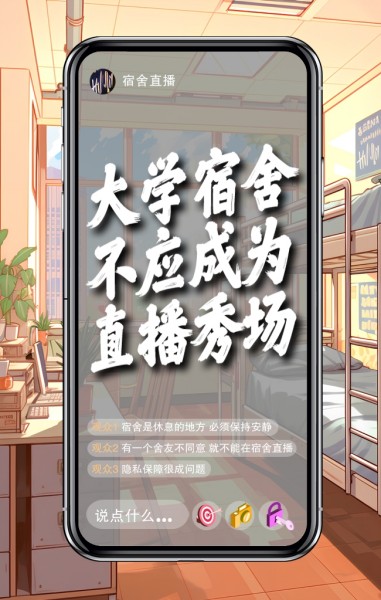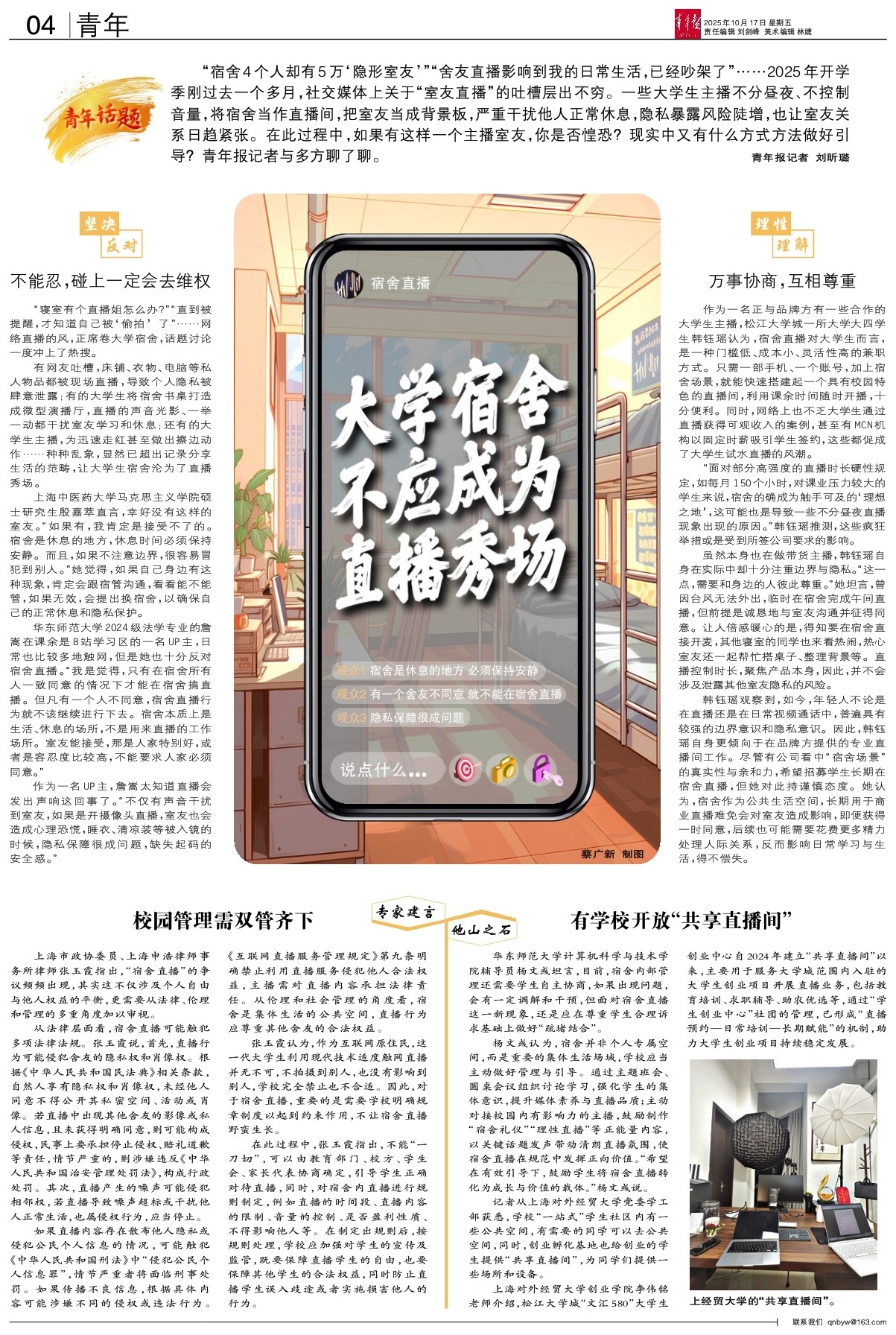 杨文彧认为,宿舍并非个人专属空间,而是重要的集体生活场域,学校应当主动做好管理与引导。通过主题班会、圆桌会议组织讨论学习,强化学生的集体意识,提升媒体素养与直播品质;主动对接校园内有影响力的主播,鼓励制作“宿舍礼仪”“理性直播”等正能量内容,以关键话题发声带动清朗直播氛围,使宿舍直播在规范中发挥正向价值。“希望在有效引导下,鼓励学生将宿舍直播转化为成长与价值的载体。”杨文彧说。