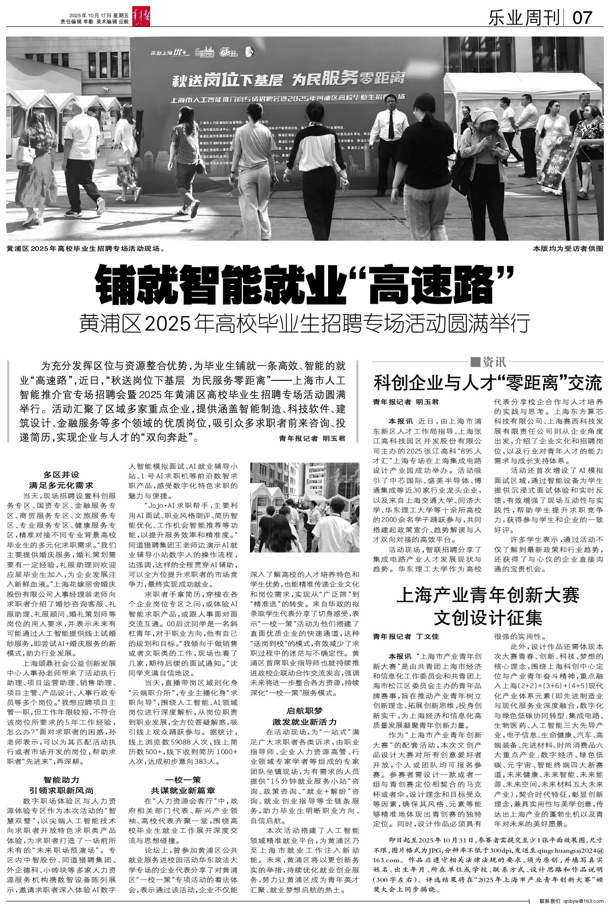 - 铺就智能就业“高速路” 为充分发挥区位与资源整合优势,为毕业生铺就一条高效、智能的就业“高速路”,近日,“秋送岗位下基层 为民服务零距离”——上海市人工智能推介官专场招聘会暨2025年黄浦区高校毕业生招聘专场活动圆