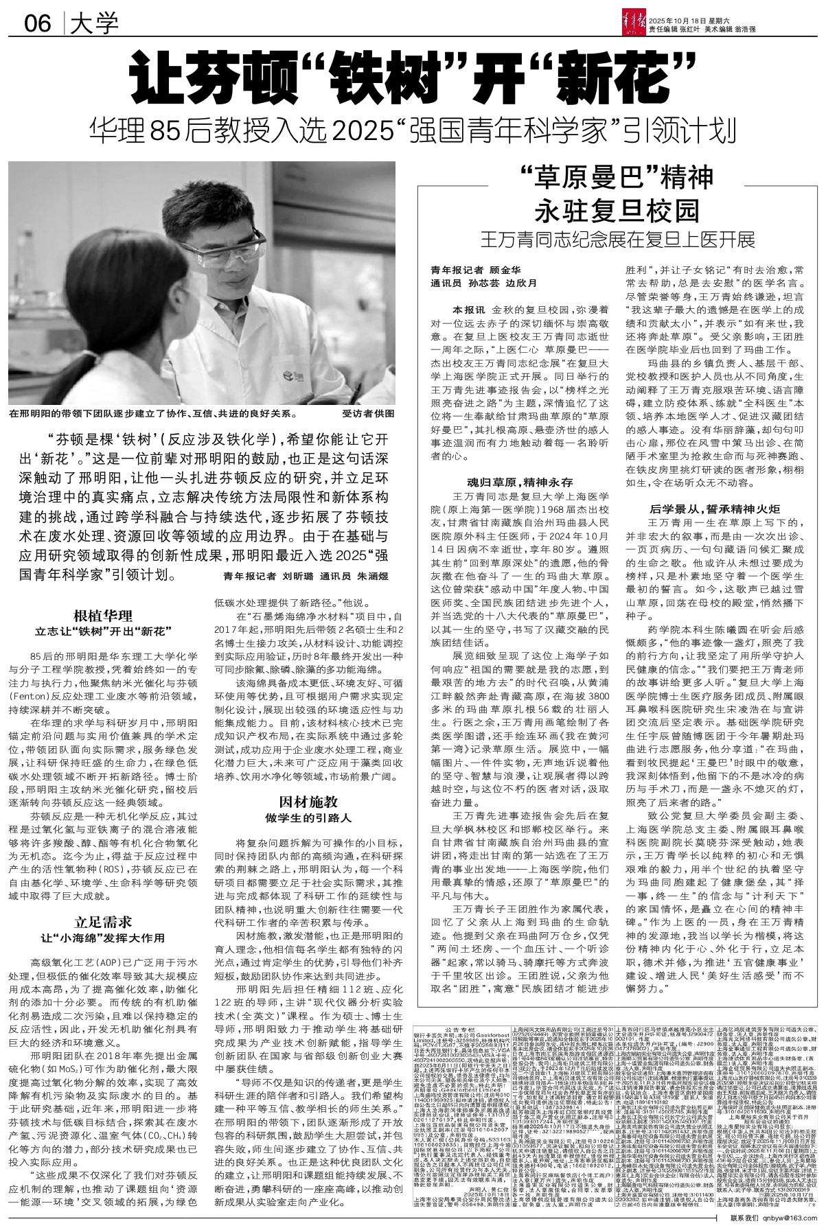 - “草原曼巴”精神永驻复旦校园 青年报记者 顾金华 通讯员 孙芯芸 边欣月 本报讯 金秋的复旦校园,弥漫着对一位远去赤子的深切缅怀与崇高敬意。在复旦上医校友王万青同志逝世一周年之际,“上医仁心 草原曼巴——杰出校