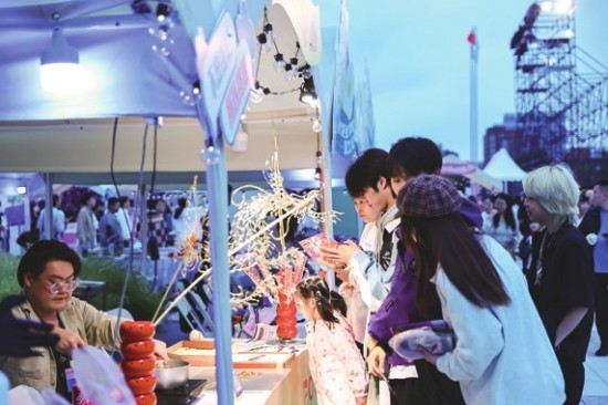 当日下午,美妆潮玩生活派对活动就已率先聚拢人气,并一直持续至与演出同步进行。这场市集藏着穿越千年的“时辰奇遇记”,以“未、申、酉、戌”4个古韵时辰为线索,串联美妆颜究所、潮玩造物局、美食补给站、露营松弛区四大区块,结合趣味任务与终极挑战,打造沉浸式“闯关+解压”双重体验。紫燕百味鸡IP“胖燕”以其“紫门首席美食官”萌趣形象亮相,成为现场人气焦点,将其“快乐美味”的品牌理念融入青春氛围。可口可乐互动区域集中了各种打卡小游戏,“一路畅赢”就可以获得品牌周边礼物,“喝得爽、赢得爽、玩得爽”,三重享受为音乐派对加满畅爽能量。上海科学技术职业学院依托上海市院校创业指导站开展科创文创融汇教育活动,苜艺千蓿、金翠云冠等学生项目集AI设计、数字媒体于一体,展现学生将前沿科技转化为文化创意的实践能力与创业潜力。