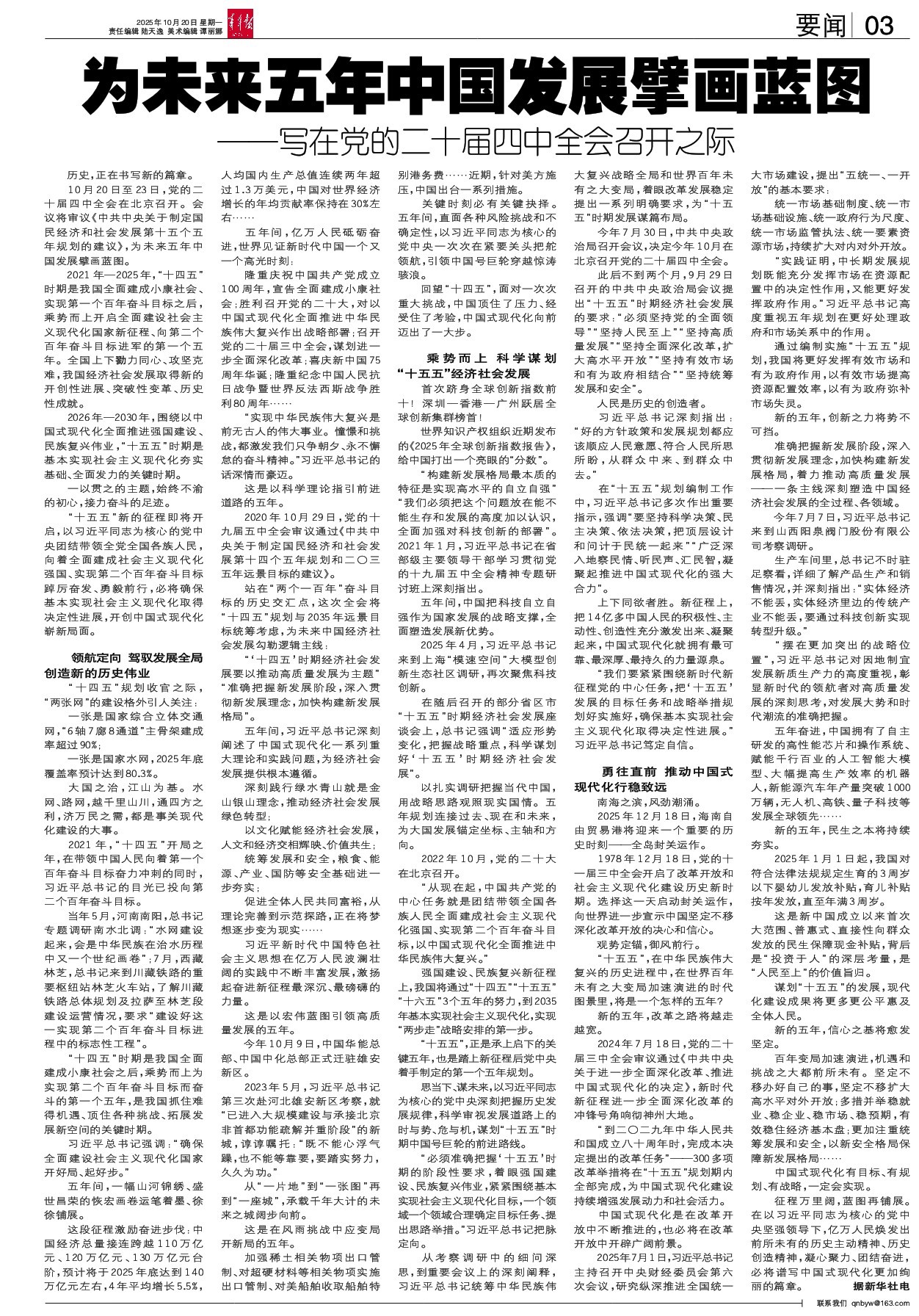 历史,正在书写新的篇章。 10月20日至23日,党的二十届四中全会在北京召开。会议将审议《中共中央关于制定国民经济和社会发展第十五个五年规划的建议》,为未来五年中国发展擘画蓝图。