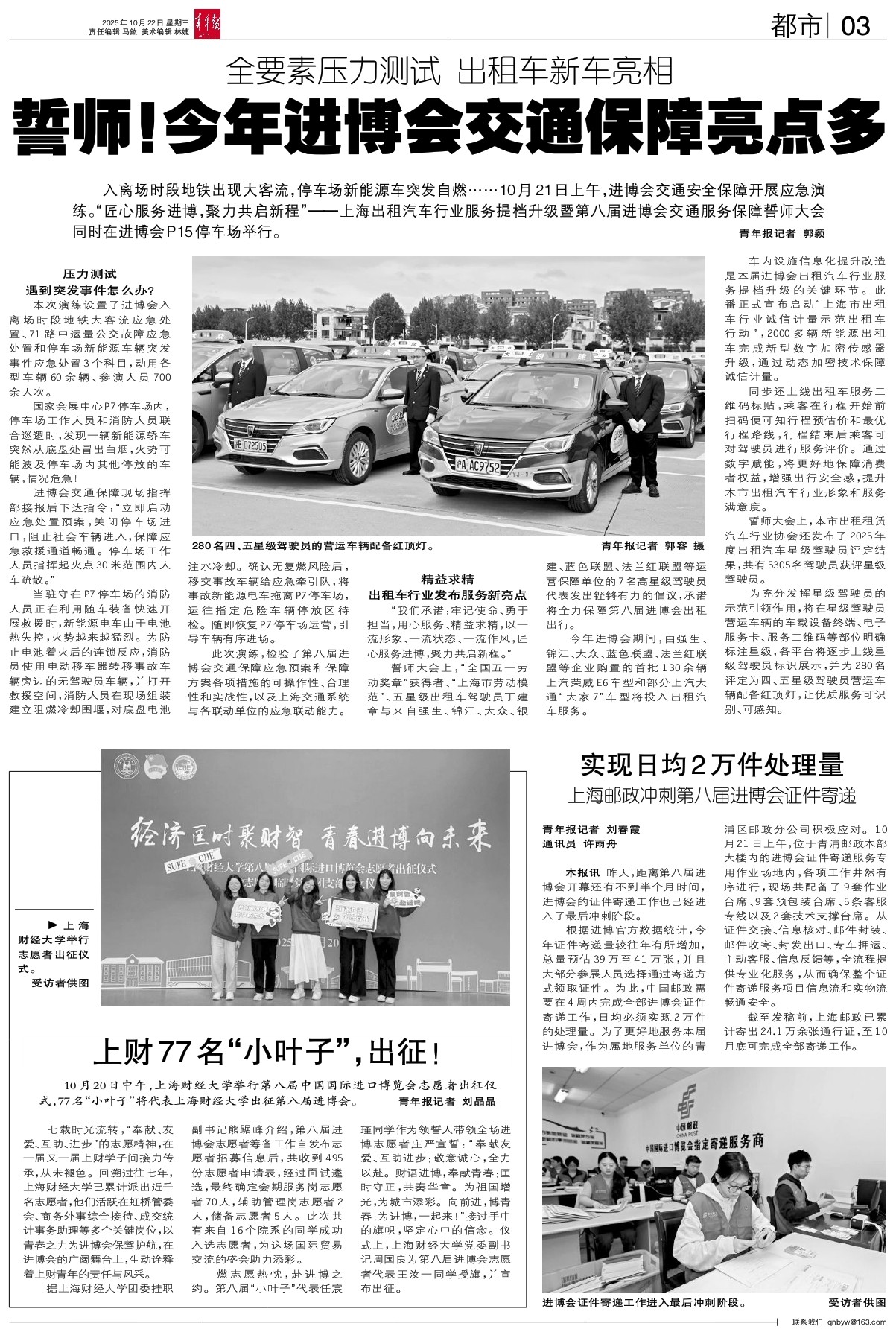 - 誓师!今年进博会交通保障亮点多 入离场时段地铁出现大客流,停车场新能源车突发自燃……10月21日上午,进博会交通安全保障开展应急演练。“匠心服务进博,聚力共启新程”——上海出租汽车行业服务提档升级暨第八届进博会交通服务保障