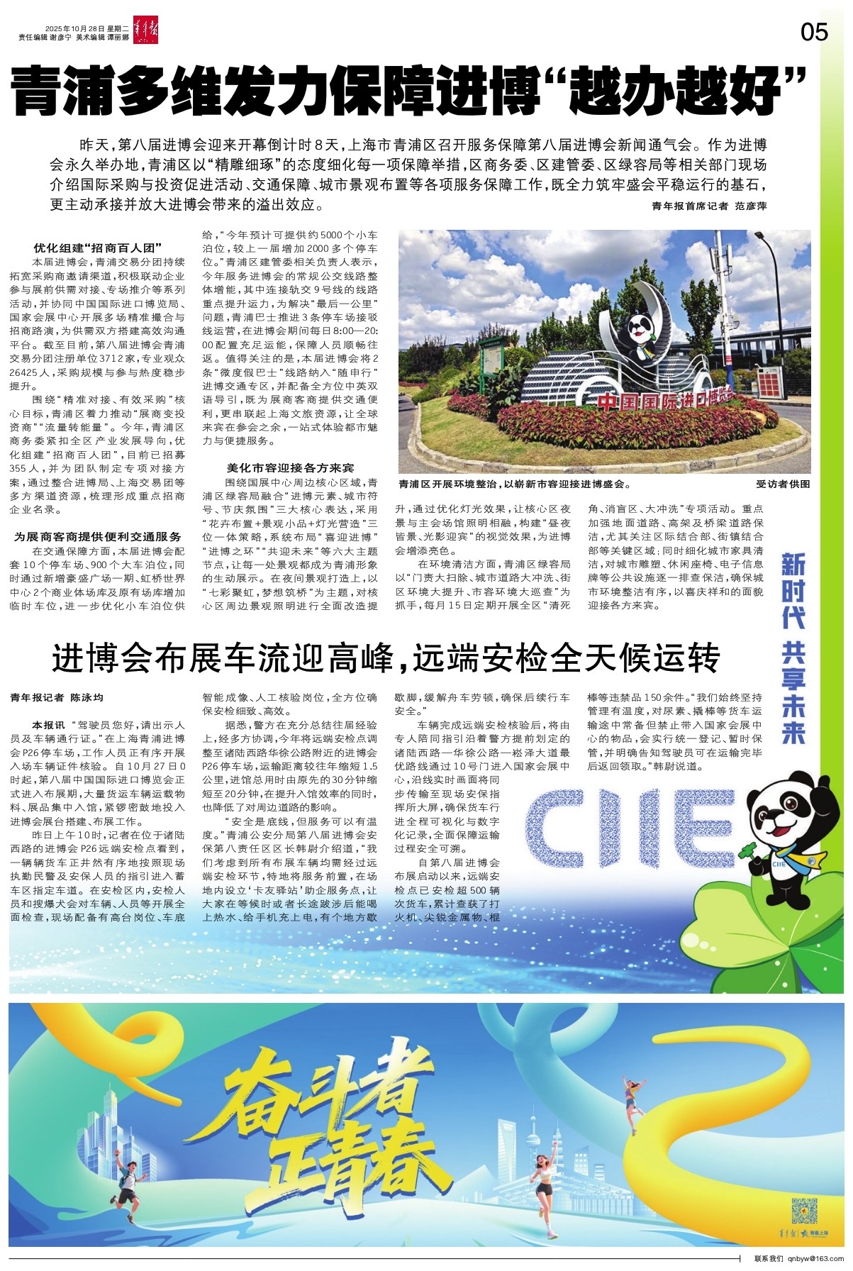 - 青浦多维发力保障进博“越办越好” 昨天,第八届进博会迎来开幕倒计时8天,上海市青浦区召开服务保障第八届进博会新闻通气会。作为进博会永久举办地,青浦区以“精雕细琢”的态度细化每一项保障举措,区商务委、区建管委、区绿容局等相关部